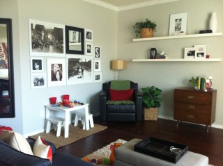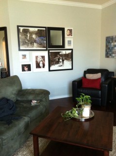 Repeat after me… Meh. Although I liked the arrangement, it was too much black once I got it up there between its neighboring mirror, chair, and end table. (Also, feast your eyes on the original living room decor.) So, I decided to remove the frames to spray-paint them white. At this point, I realized that I had accidentally purchased flat finish spray paint. Dang. But being the impatient girl I am, I said, [the less classy version of] “Oh well!” and painted them anyways. Luckily, I ended up liking them better with a flat finish. So, happy accident there.