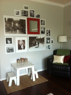 Then, a few months later, a good friend commented that it would look better if the photos were all black and white. I had thought about that previously, but honestly, was just too lazy to get the pics reprinted again. Her tactfully put and appreciated comment got the wheels turning. I printed the B&W pics on plain old computer paper first to make sure I’d like them (I printed some of them in larger sizes as well to do away with some of the matting). ….and I LOVED them, so I got them reprinted in higher quality photos (as in, higher quality than computer paper), and I was left with this….