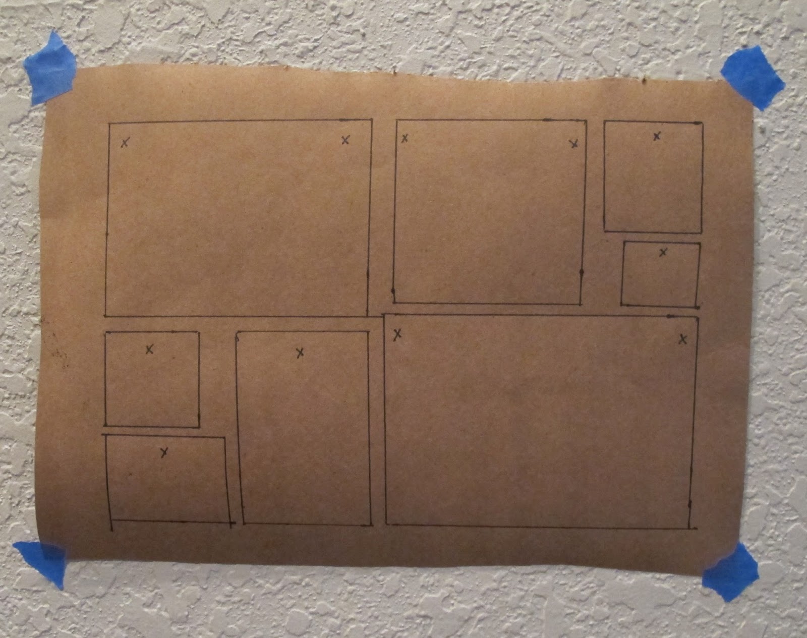 Then, I decided that I needed a template to assist in hanging them. I found this tutorial on Young House Love and followed their lead. To start, I unrolled some brown paper onto the floor and laid the frames on it in my preferred arrangement (In hindsight news, if you’re planning a project like this yourself, put the paper under the frames first. Not sure why I didn’t think of that myself.). Anyhoo… Next, I traced the outline of each frame onto the paper with a pen. I measured where the hooks were located on the back of each frame and marked them with “x”s in their corresponding boxes on the brown paper. Then, I hung the brown paper on the wall with painters tape and moved it around until I was satisfied with the placement. It looked a little like this….
