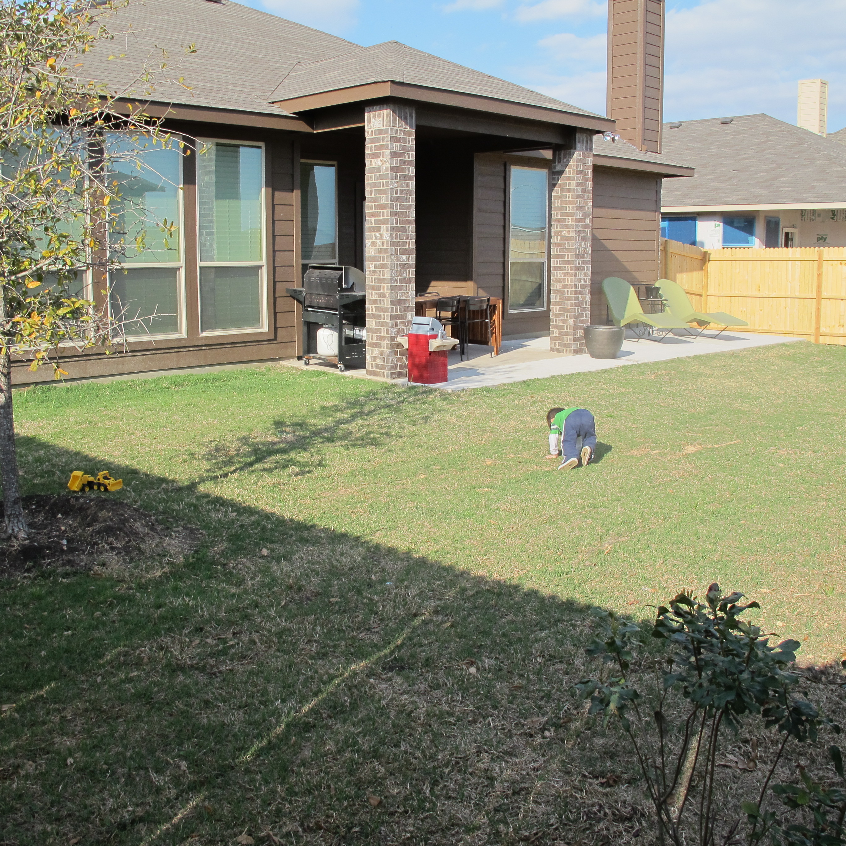 We knew that building a house within our budget meant having a smaller yard. We weren’t sure if we’d like it, but to our surprise, shortly after moving in we discovered that we LOVE having a smaller, flat yard. It’s less upkeep and more useable space than our last yard (which had a steep hill that came towards the house. Not exactly kid friendly.). Plus, it just feels more cozy, especially when sitting under the covered porch. And we’re happy to report that we’ve utilized this yard more in the last 7 months than our last yard over 4 years.