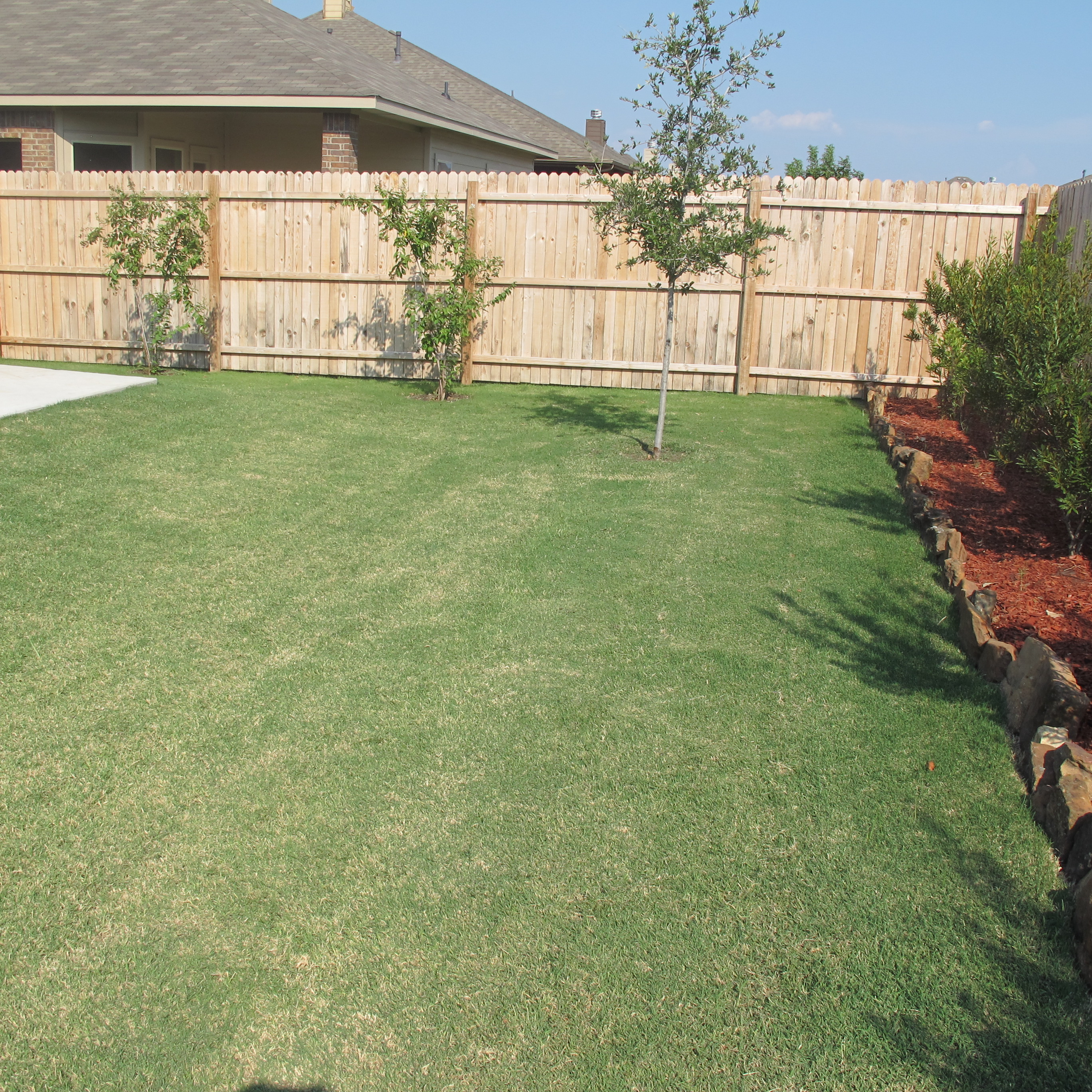 The wax myrtles were planted along the back fence to eventually form a tall hedge. At first we just planted the bushes, but after they proved to be a challenge to mow around, Joey covered the grass with landscape fabric, then added mulch and bordered it with moss boulders. He ended up having to go back and add cardboard under the mulch as well, since our grass would apparently survive a nuclear explosion. Yep, eventually only cockroaches and Bermuda grass will rule the earth. Anyways, the tree was planted towards the side of the yard in hopes that it will eventually provide a nice shady canopy and privacy for the master bedroom windows. (P.s. I called the tree farm about the leaves turning brown. Apparently, it’s under stress from the heat and unintentional under-watering (despite our best intentions). We were instructed to water it for 90 minutes, three times per week, using a 1/4″ stream, which I’ve been doing religiously since then).