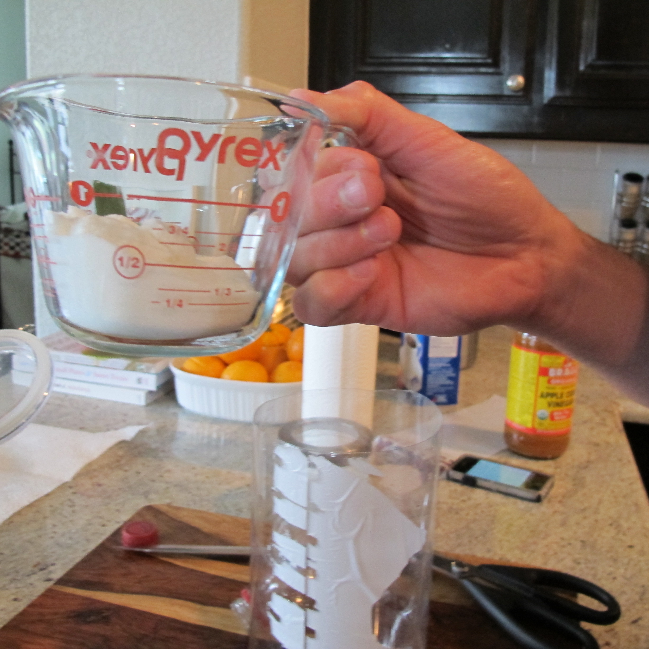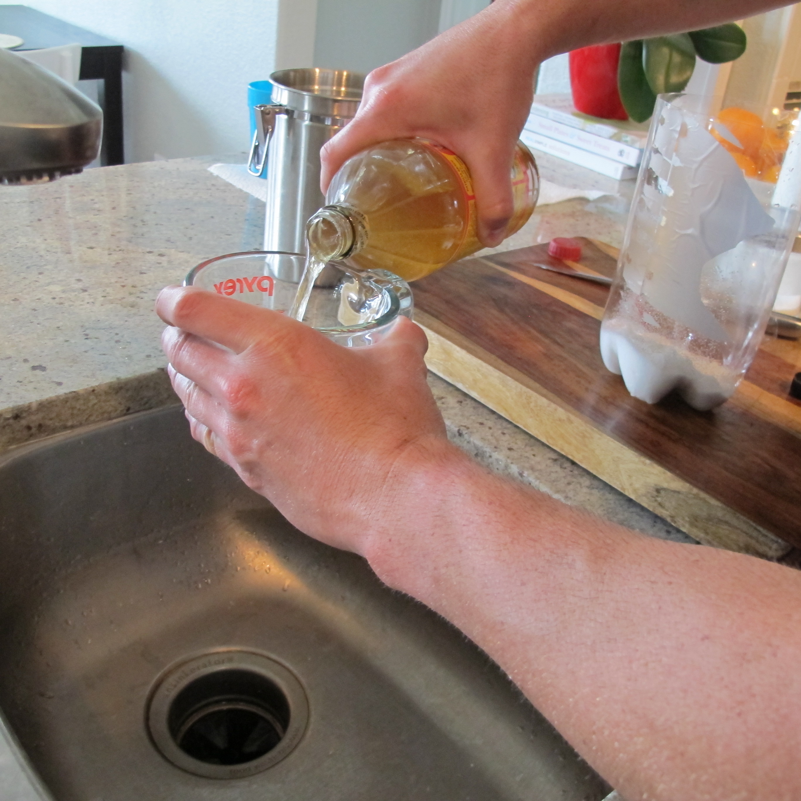 He filled the bottle with 1/2 cup sugar and 1/2 cup apple cider vinegar, then added a splash of water and stirred.