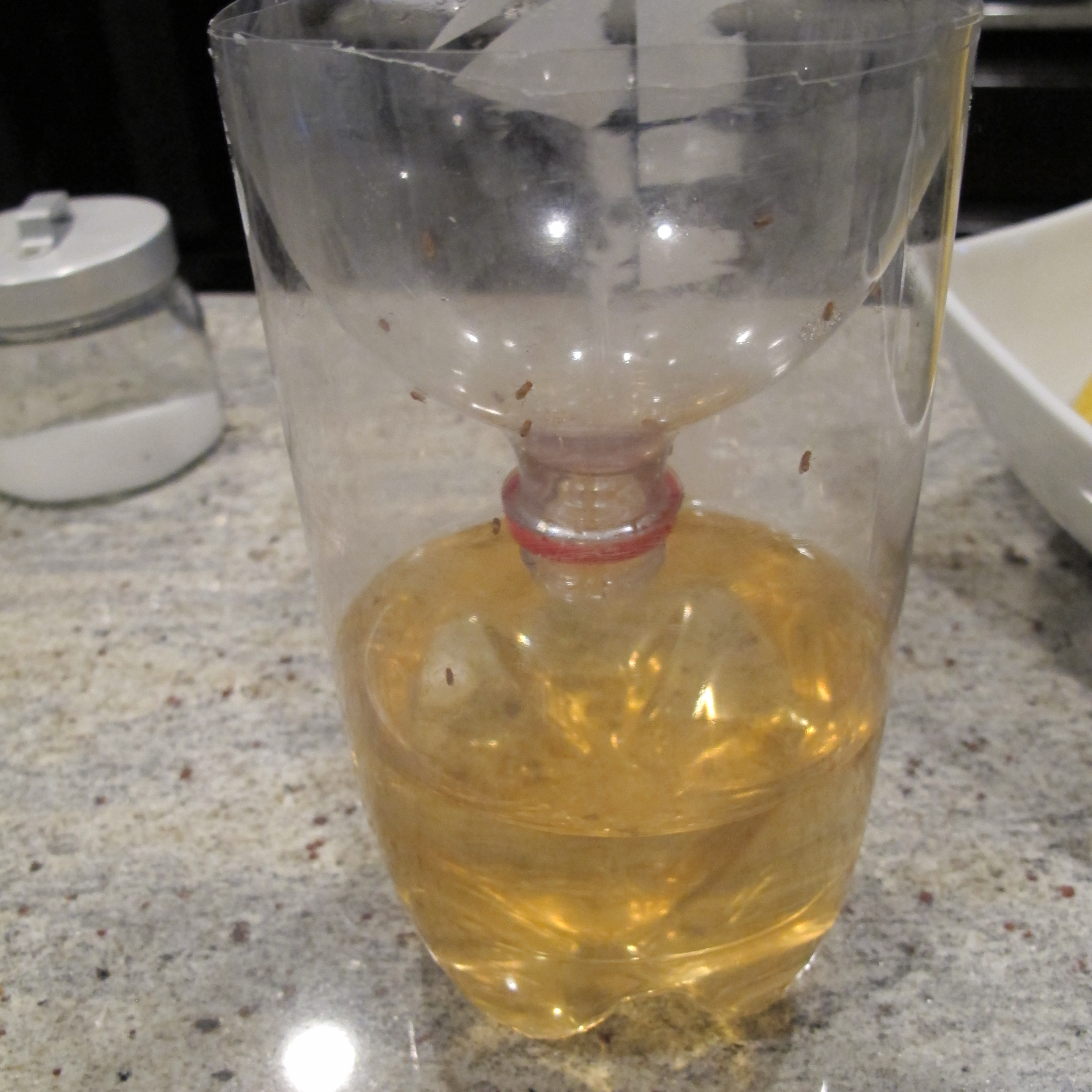 Then, we placed the bottle next to our trash can to attract gnats. We moved the trap around the house occasionally, if we happened to notice a large concentration of gnats in one particular place. The idea is that the gnats are attracted to the vinegar/sugar, fly into the bottle and can’t get out.