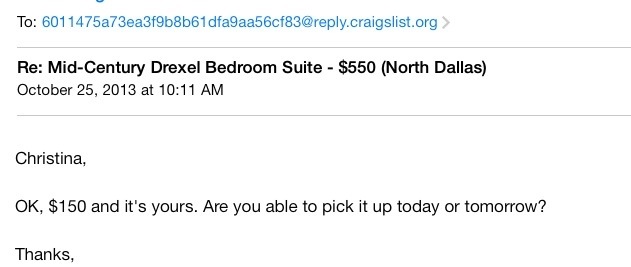 Miraculously, I was the very first caller. The seller happily agreed to sell the dresser set to me and said that I could pick it up the following day. I. Was. Elated. I couldn’t believe that I’d gotten it. That such perfect furniture could be mine. I was on cloud nine the rest of the day. After speaking with Joey to nail down an exact time (which I’d discussed earlier with the seller) I called her to confirm. And she didn’t answer. Oh no. After several hours of staring at my phone, I texted to let her know that we could come out earlier if that was more convenient for her.
