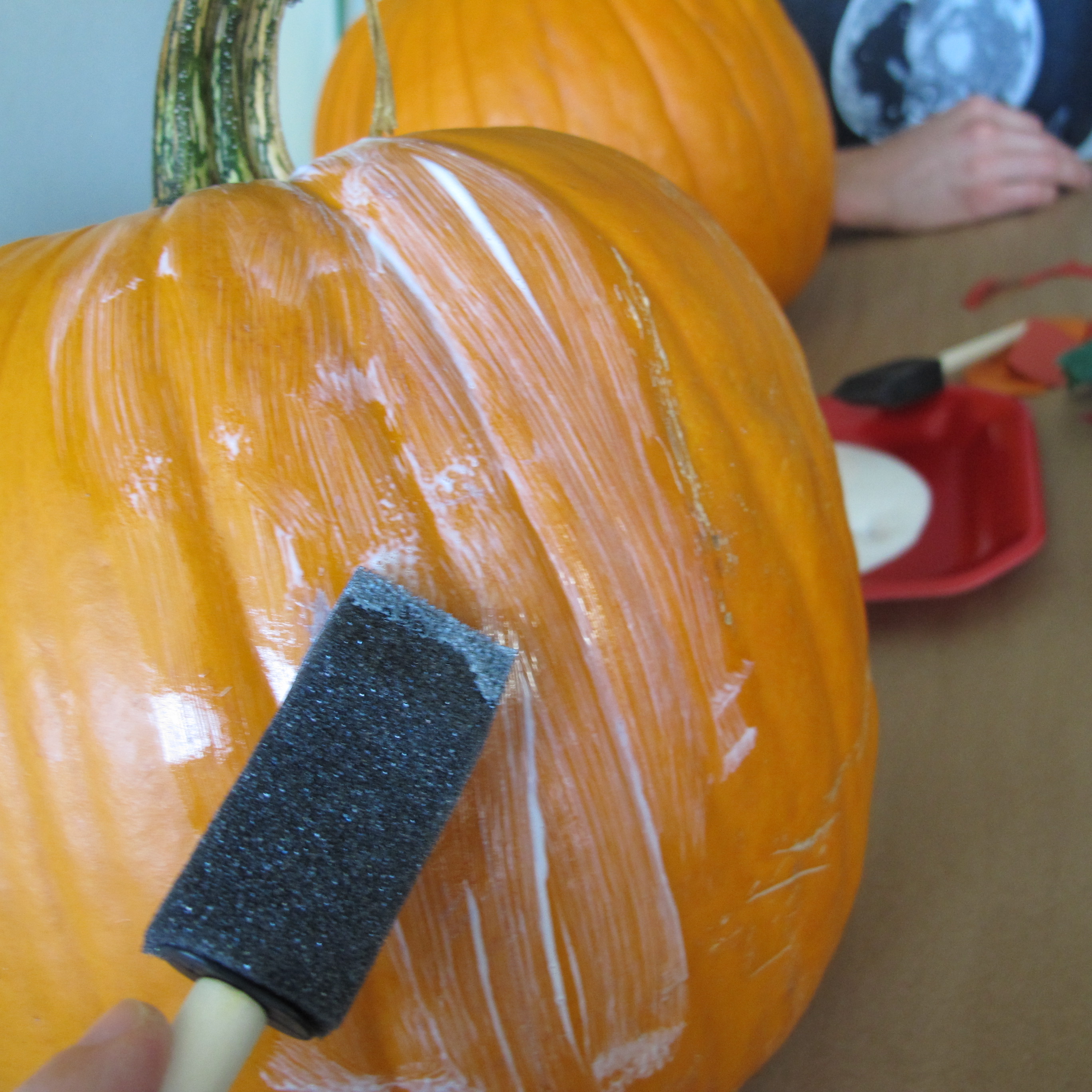 Then, we got to work. We used foam brushes to smear the Mod Podge on the pumpkin,