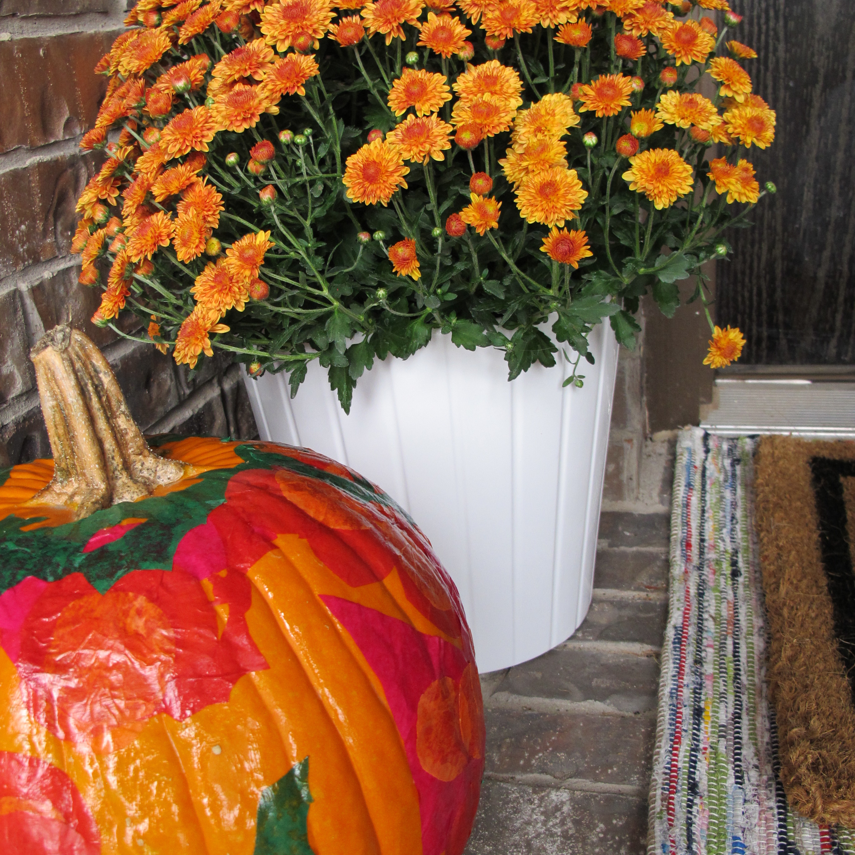 Then, we added another coat of Mod Podge on top of the tissue paper. It worked better when we waited a few minutes before Mod Podging the second coat. If the paper became too saturated while it was still mobile on the pumpkin, it tore more easily.