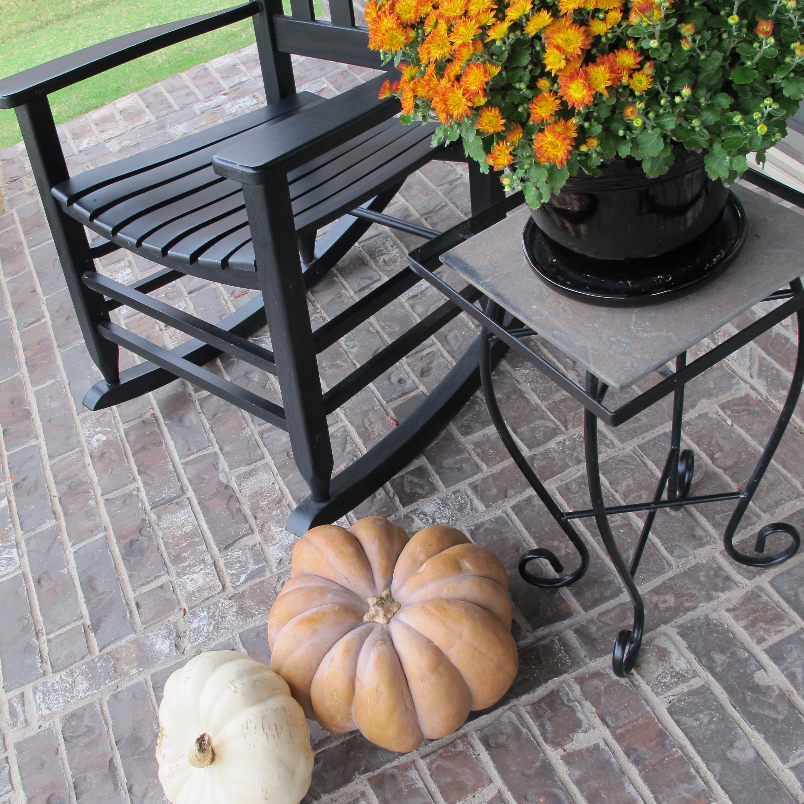 I have to say I’m proud of myself for decorating the porch. BEFORE the first fall holiday.  I still want to make a wreath for the front door, but at least there are signs of life now. Our porch says “Hey, hot stuff. People LIVE here.” Not that Mat didn’t. It’s just more obvious now.   Flowers, a few pumpkins, and (gasp!) I cleaned the chair. Did you know it’s actually black? I’d almost forgotten.  These simple additions are definitely not ground-breaking, but a happy improvement from this for sure…