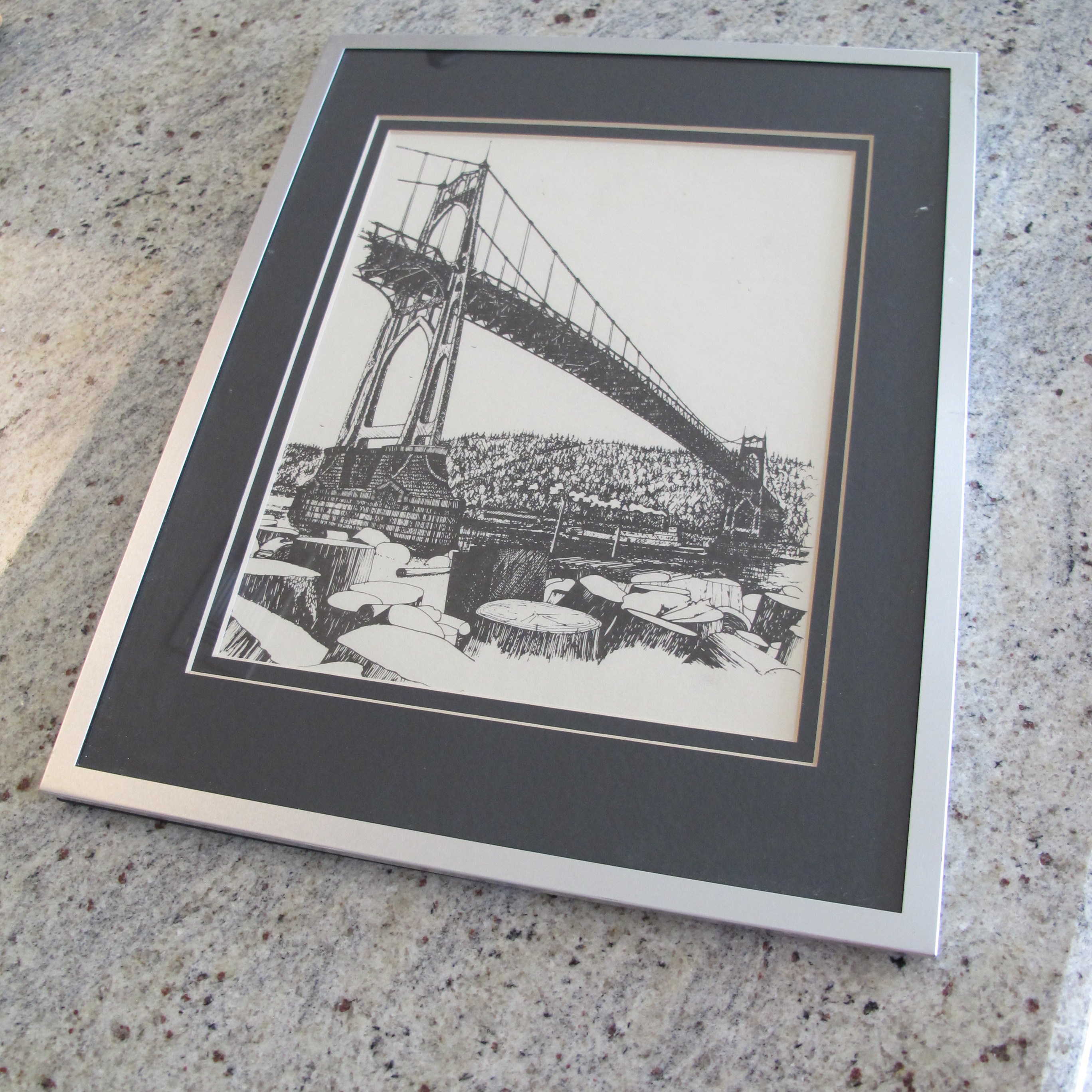 I wonder if his patent ever went through.   Next, we have this awesome ink drawing of St. John’s Bridge in Oregon….