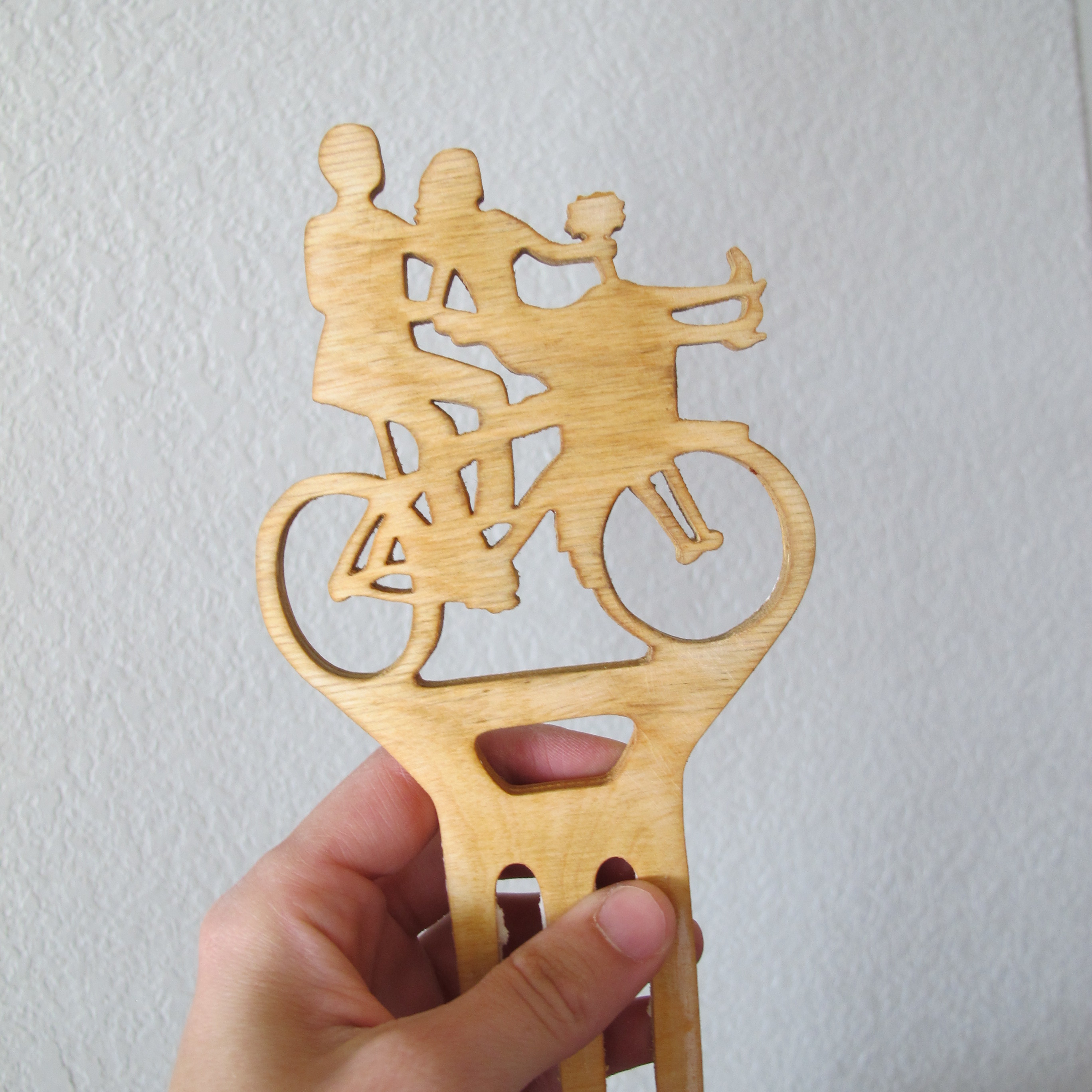 I had searched high and low for a cake topper with a bride and groom on a bicycle, only to find one cartoony (read: ugly) one, so Joeys parents graciously offered to make us one.  It was drawn by my mother-in-law and cut out in wood by my father-in-law.  And it turned out awesome.  Grossly enough, it still had frosting on it when I pulled it out of the box.  I’m wondering why I packed it like that. Ick.
