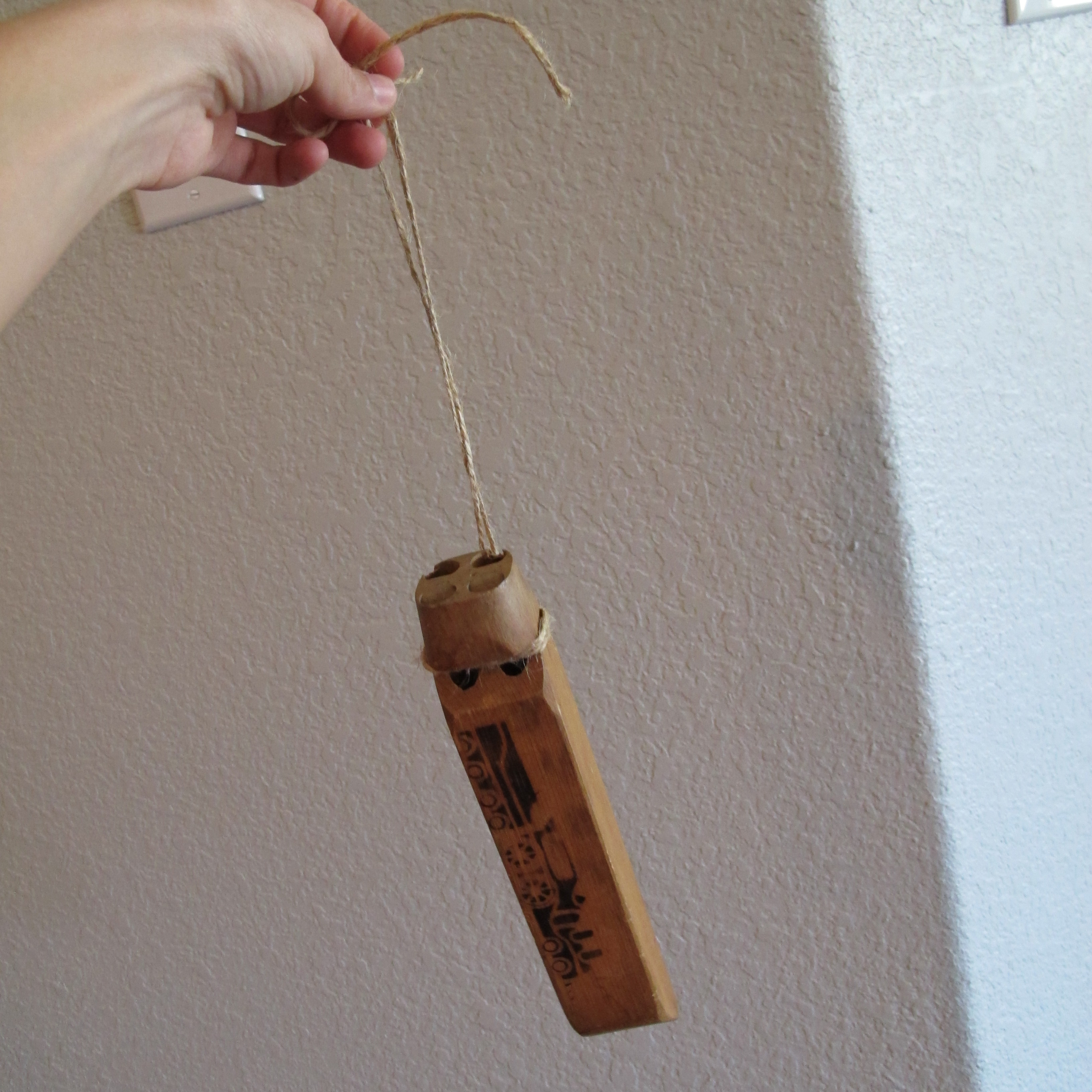 It sounds like a train whistle when you blow into it. The picture of the train is burned on.  And check this out…