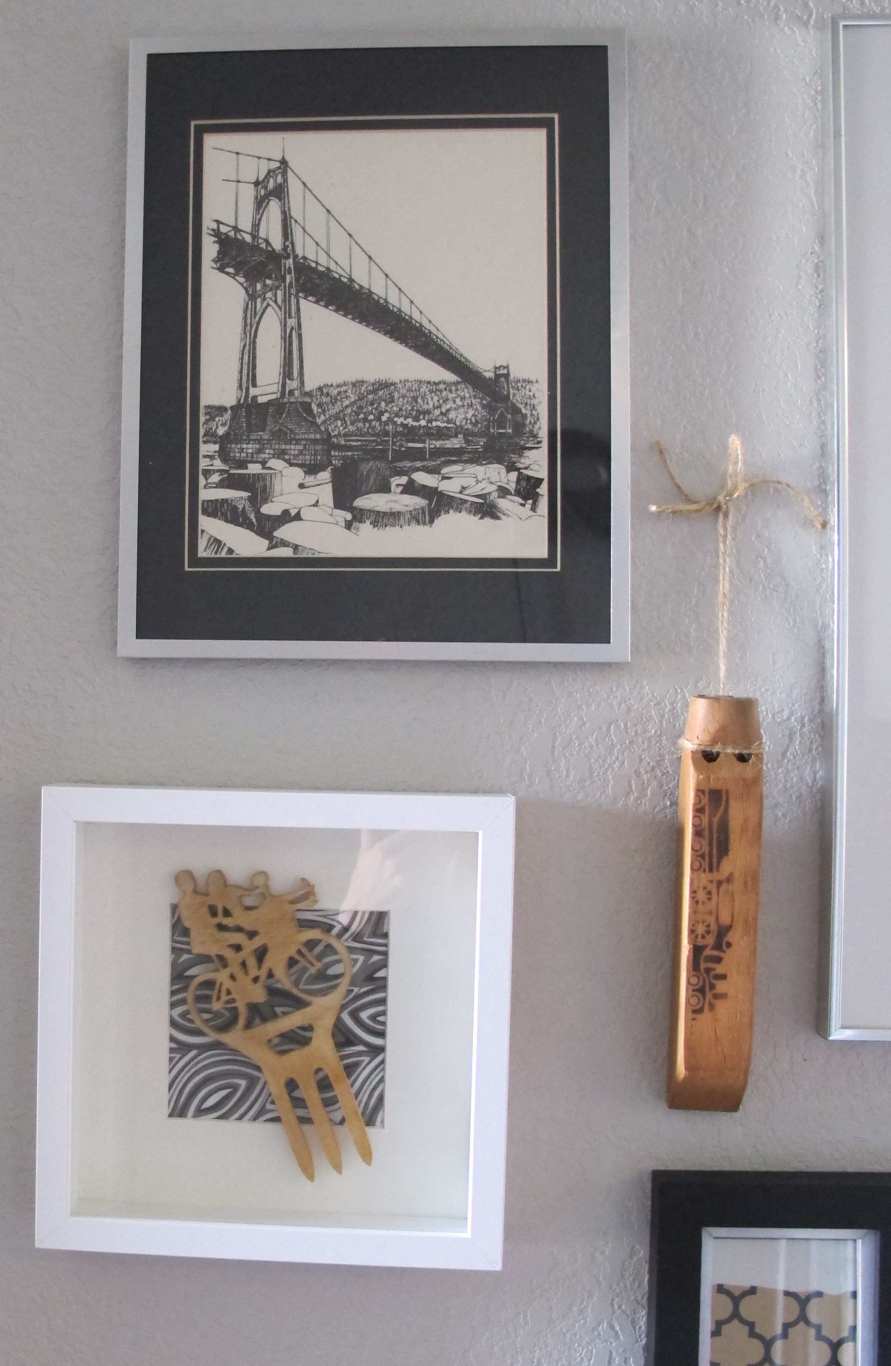 But the arrangement felt a little lost on the wall and slightly off balance. I adjusted the length of the twine on the whistle to lower it some and added a few more frames up top (that were also found in storage. Seriously, shopping in your old stuff rocks.)….