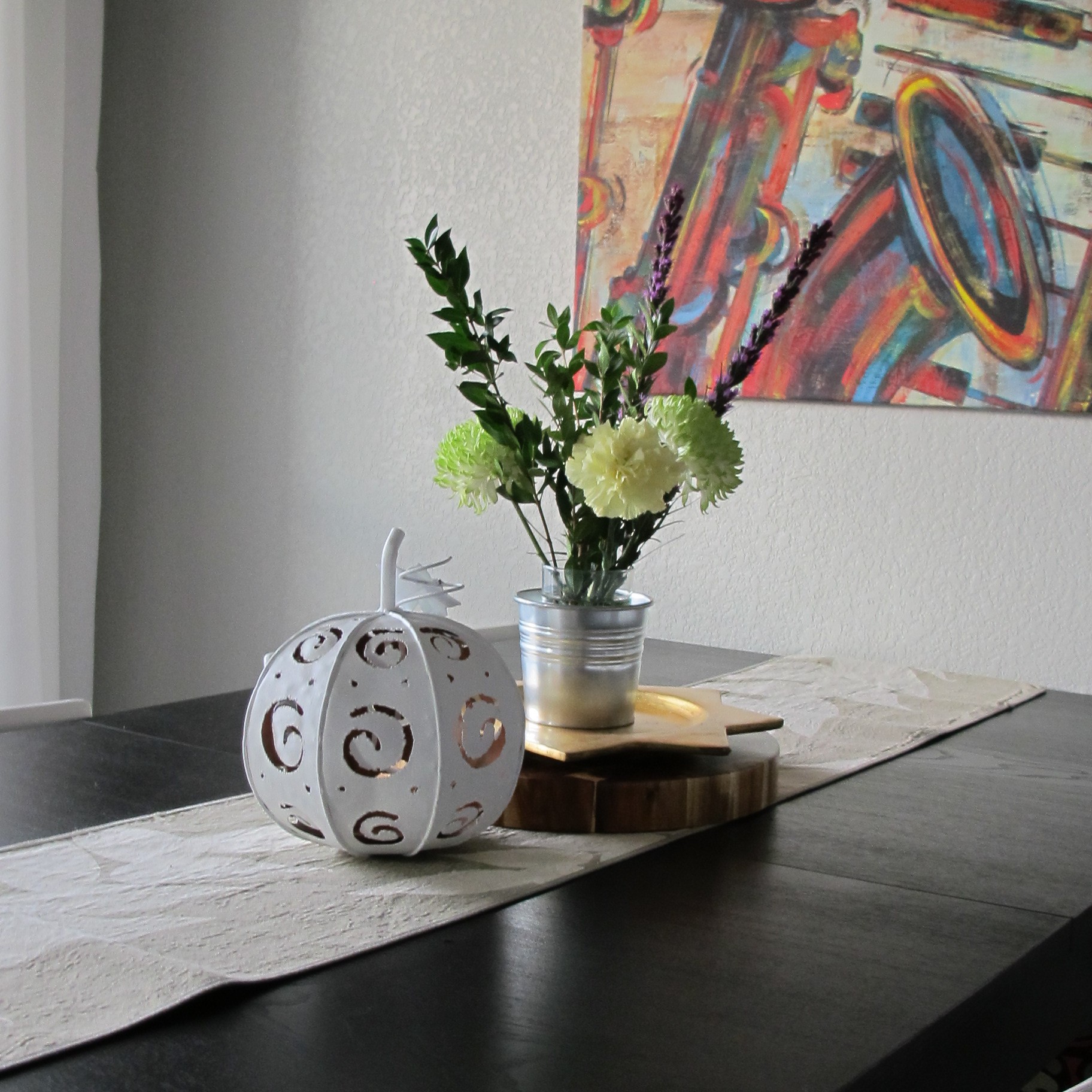 I stuck some fresh blooms in a glass, which is set in a small Ikea galvanized bucket. I placed them on top of a gold starburst charger (found for $4 at Goodwill) which is on top of a round butcher block cutting board. Then, my good ole’ spray-painted pumpkin made a reappearance to join the fun. I swapped out my more neutral leafy runner for a slightly more modern sage and cream leafy runner to complete the look. And again, I’m lovin’ my mixed metals with the stainless and gold. Muwhah! Kisses, my sparkly friends.