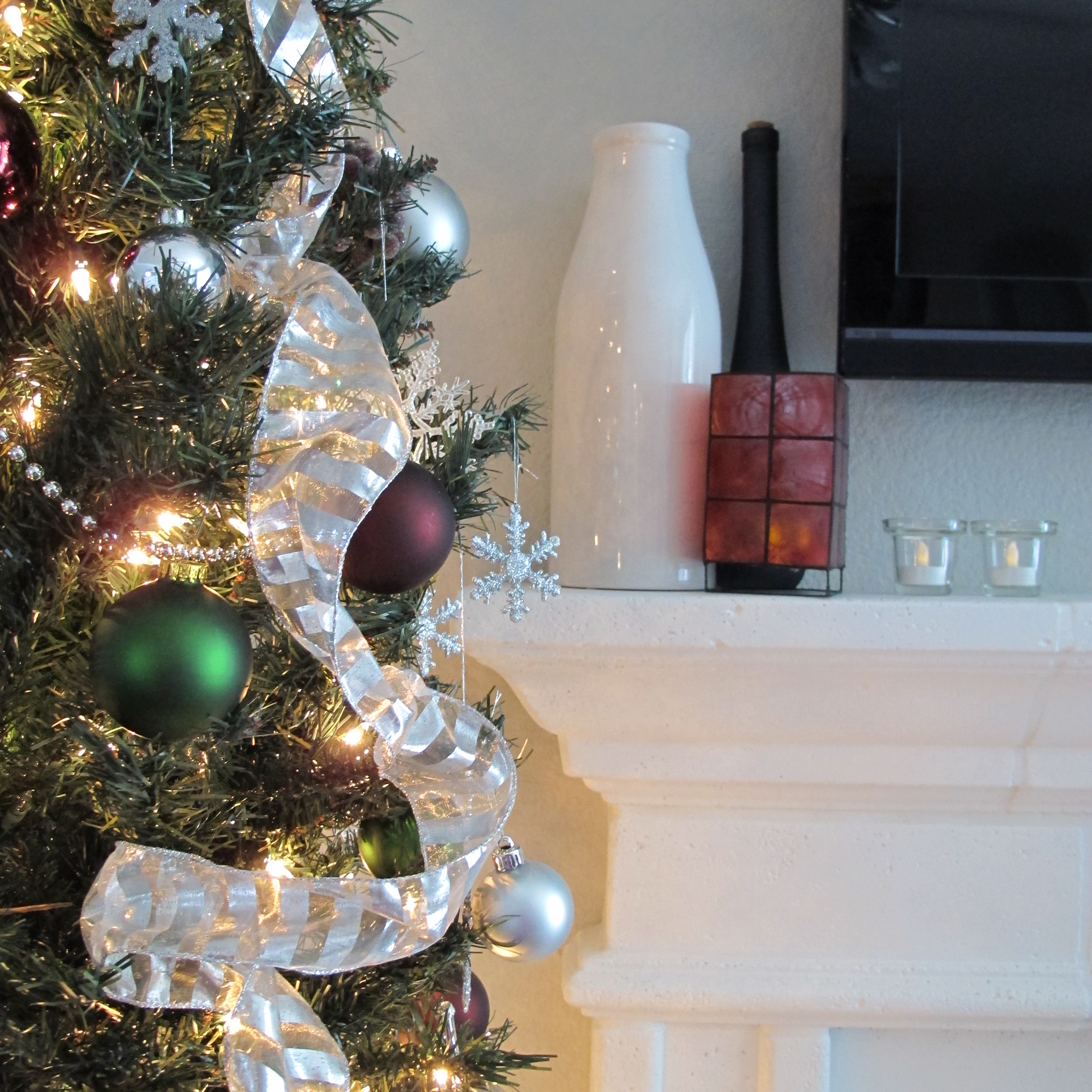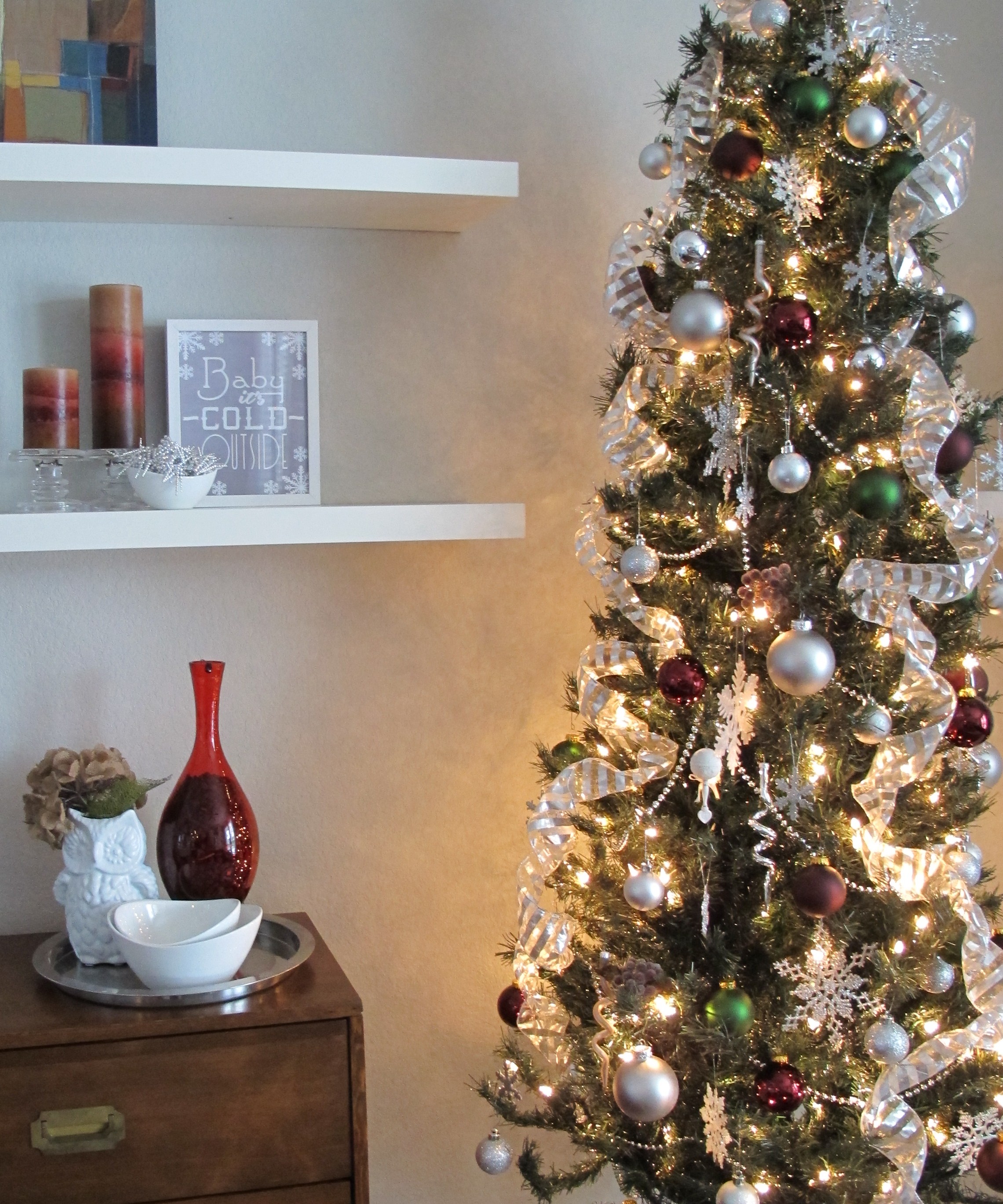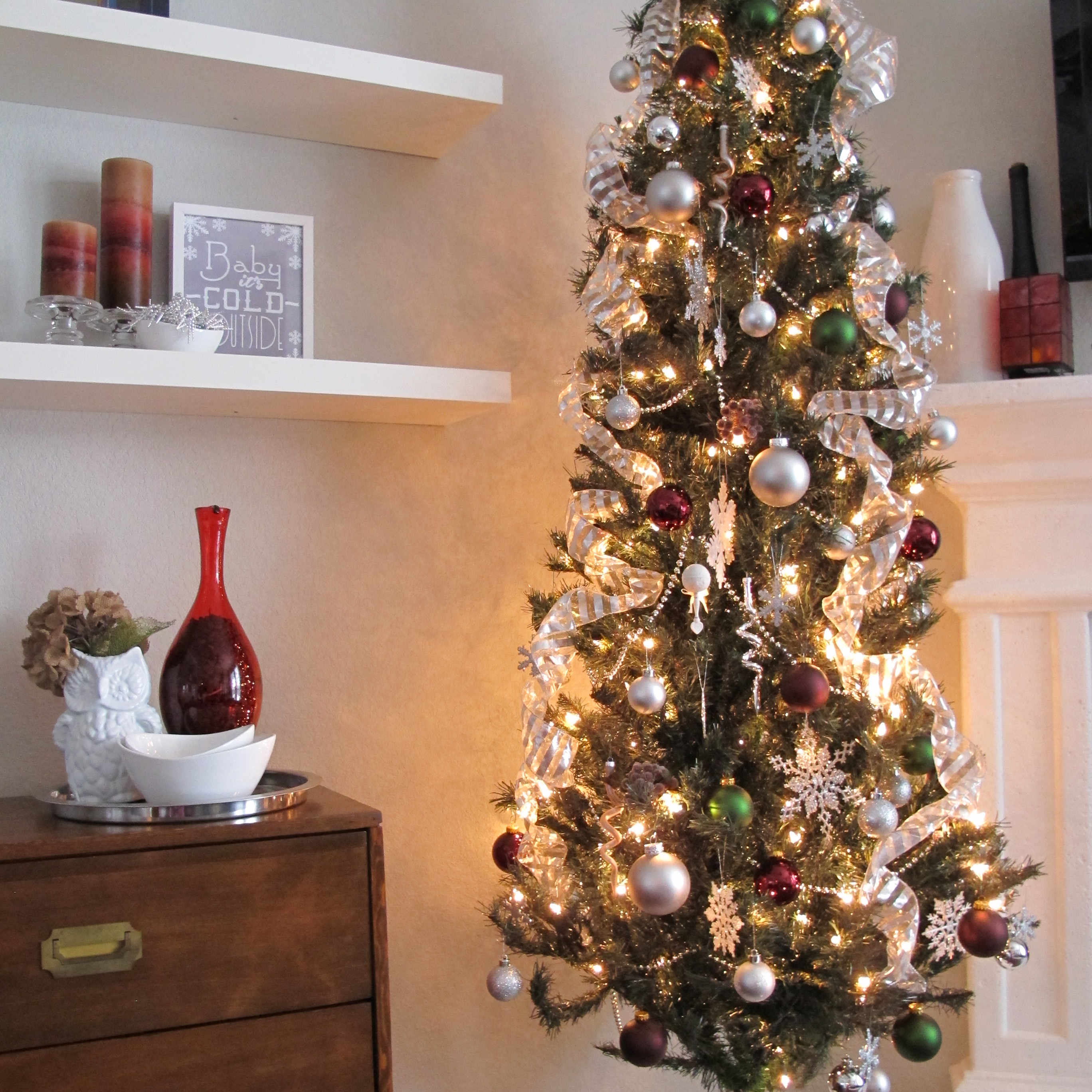 For adornment, we went with a silver, burgundy and deep green theme. Partially sheer, striped silver wire ribbon simply looped down from the top. Strands of silver beads. Colored, round ornaments in various sizes. Plastic, glittery snow flakes and a few randoms to break it all up. Super simple.