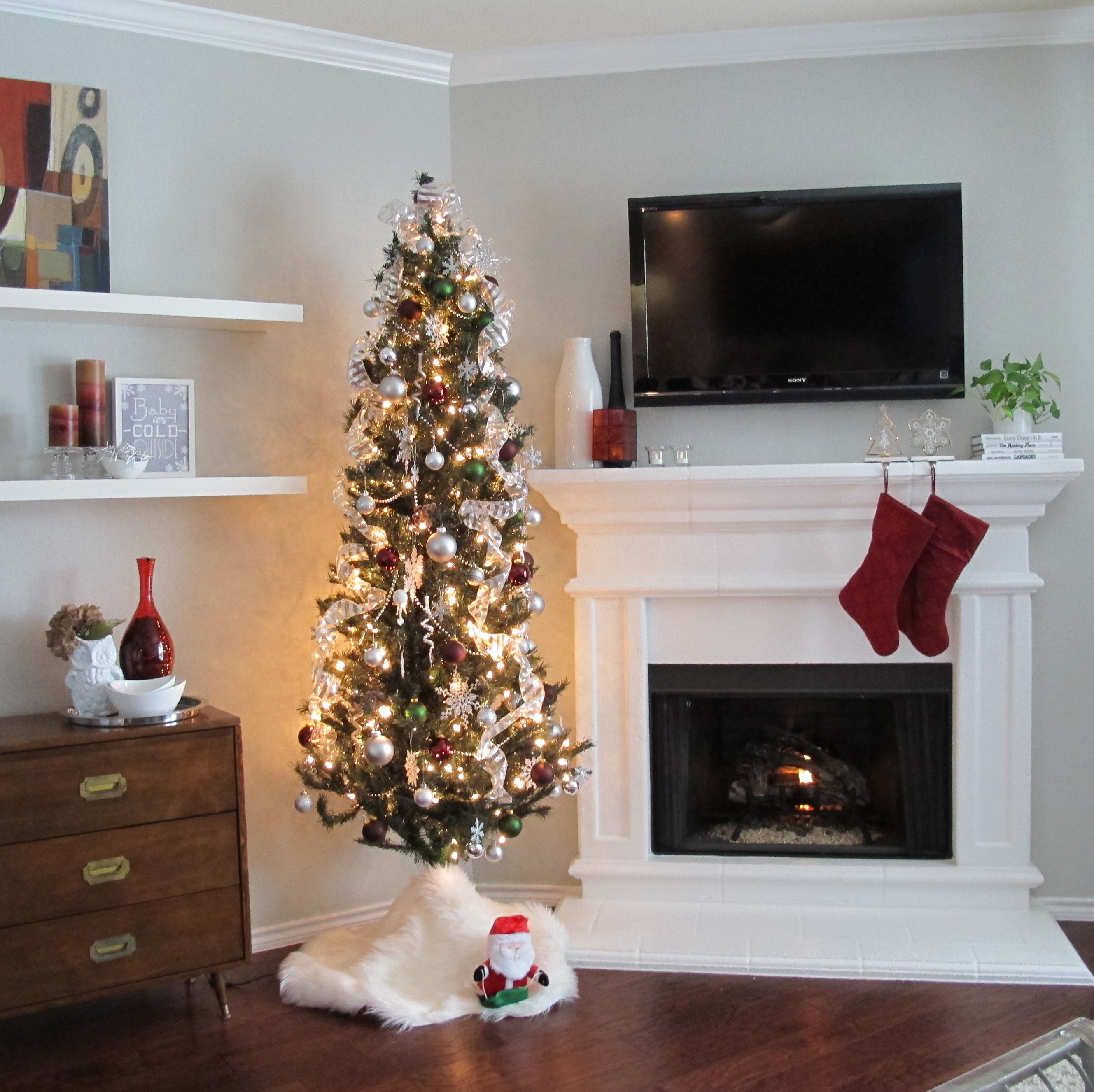 We have a nice tree skirt, but it didn’t mesh well with our dark floors (it’s a dark olive color that looked great with the floors in our last house, but here, not so much). So, I used an old white curtain and draped a faux sheepskin over top instead. FYI, the Santa dances. And is awesome.