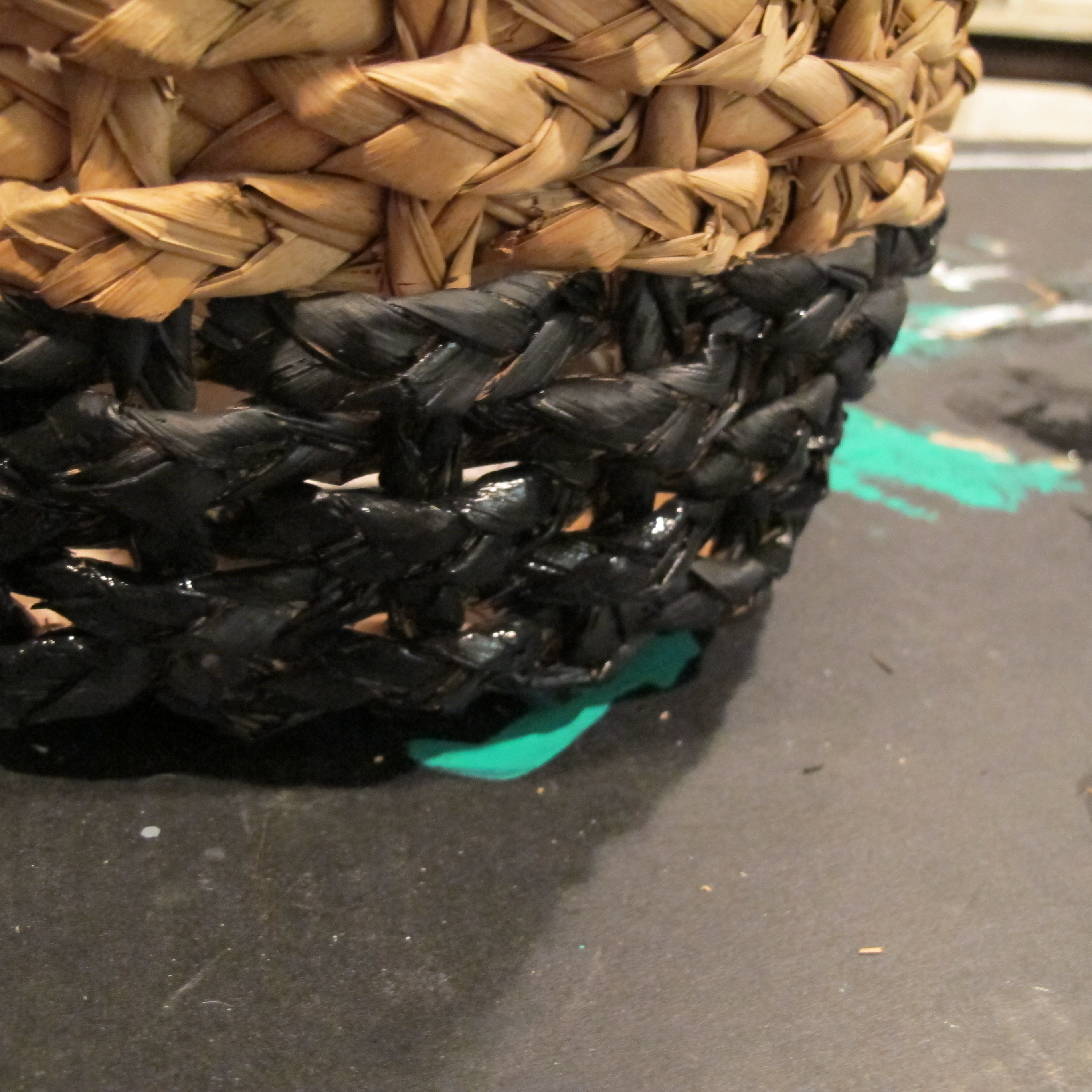 I simply chose a row on the basket roughly halfway up to use as my stopping point and free-handed the top row with a small craft brush. Then, I filled in the basket below with paint (sorry, no pics). In the end, it looked like this (It’s still partially wet in this pic)….