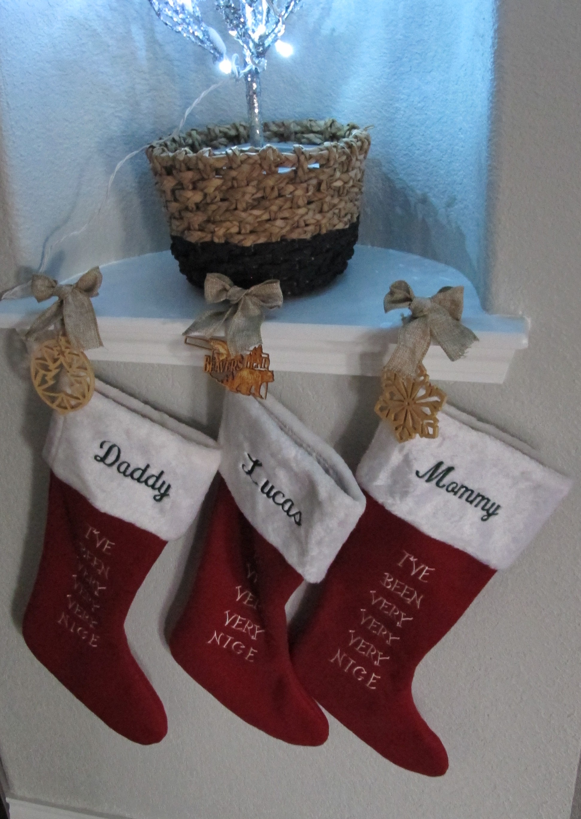 I hung three stockings that my mom embroidered for us below it.