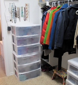 I stacked my plastic drawers here to make better use of the vertical space, rather than having them take up all the floor space under my hanging clothes….