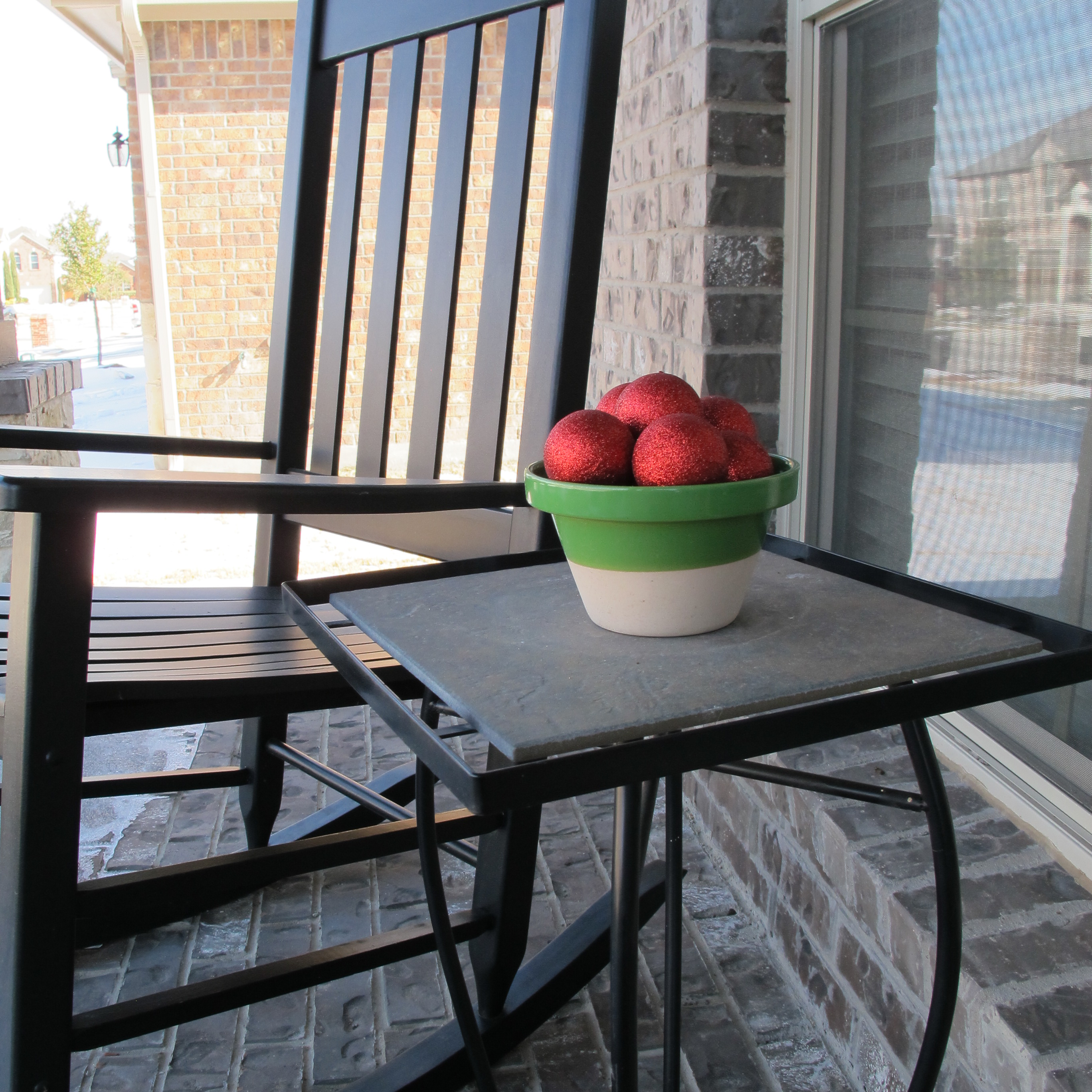 Over by the rocker, I first filled a small ivory and green pot with red ornaments. Super simple and easy.