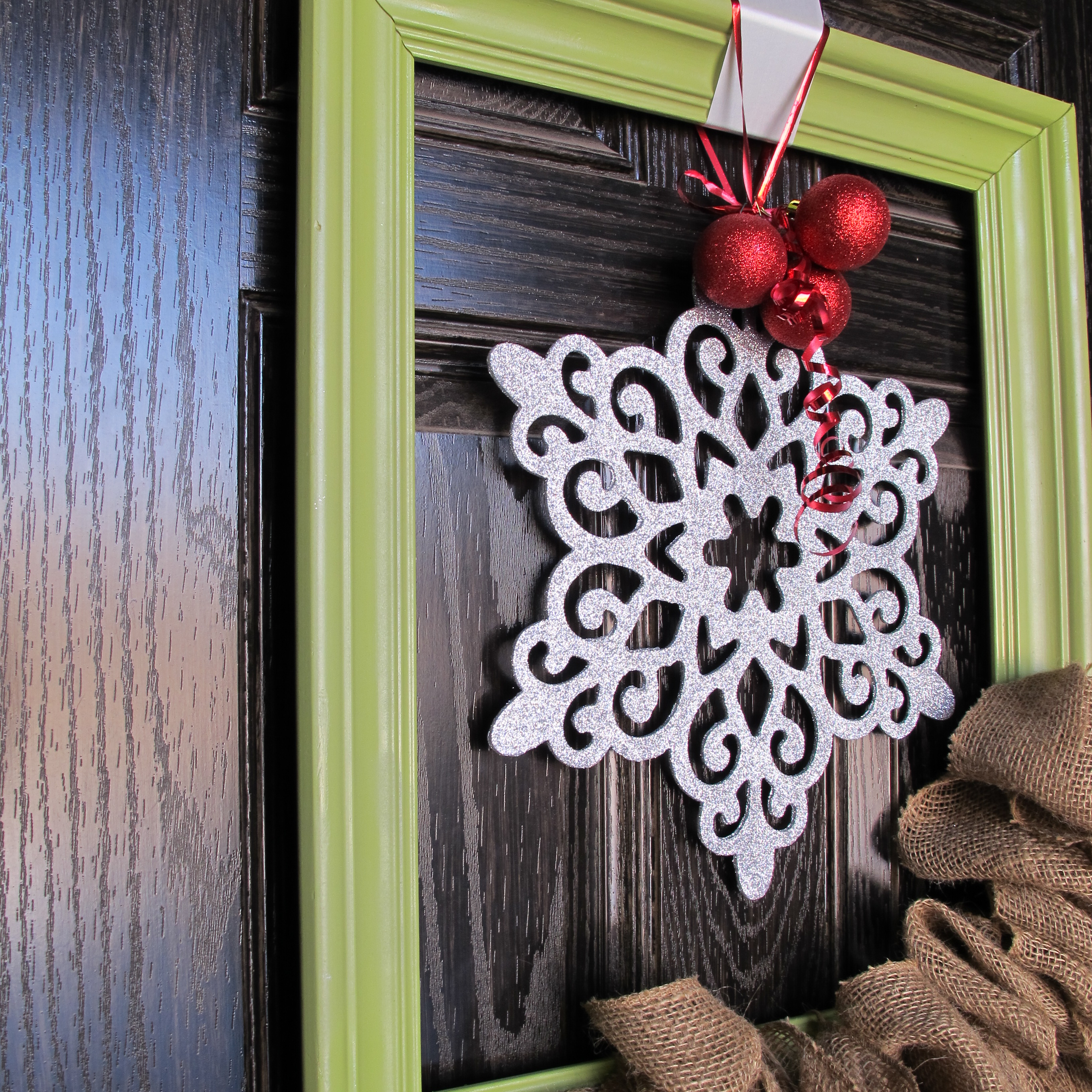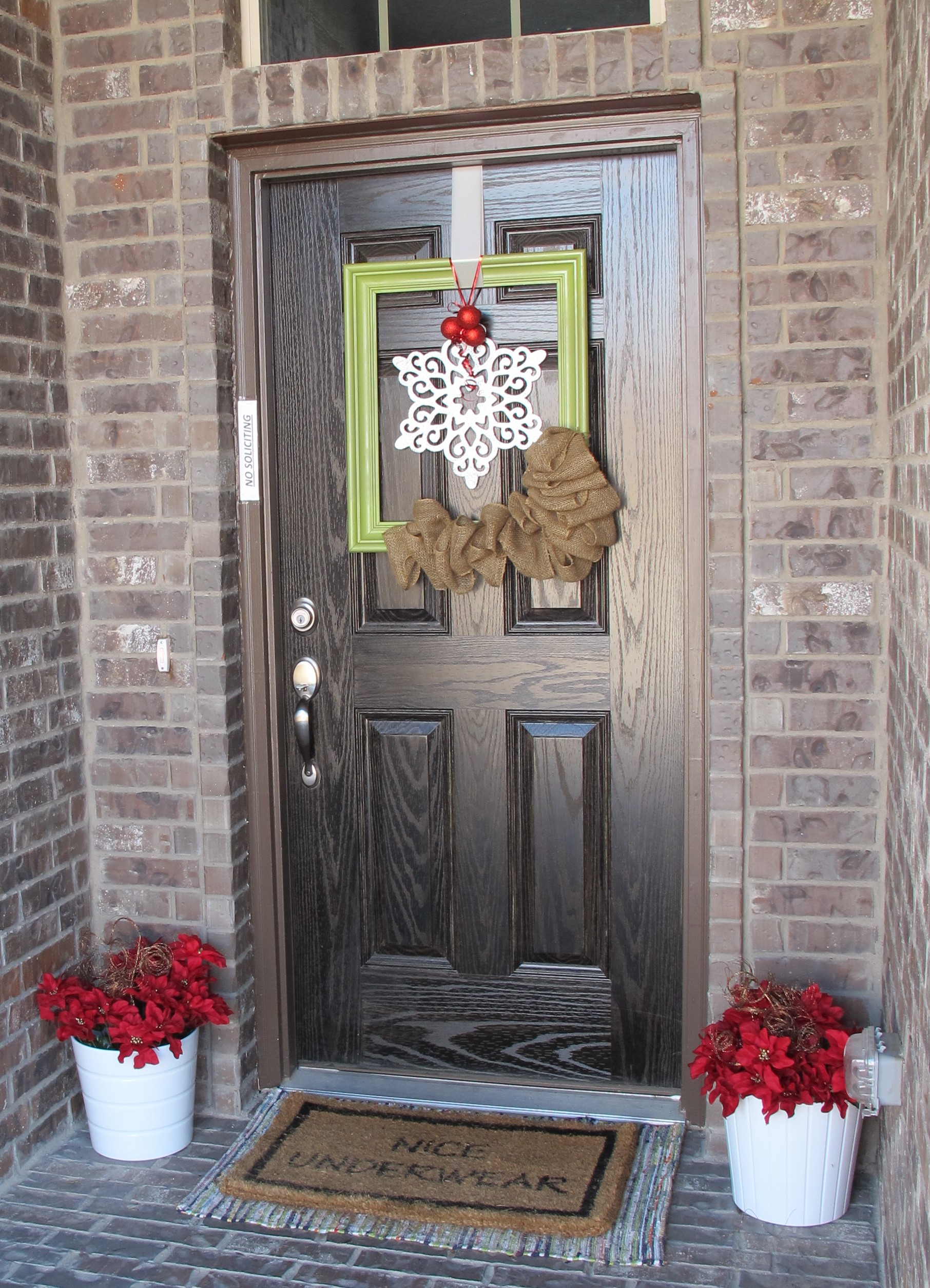 …And now that I’m adding pictures to this post, I’m realizing just how much the burlap has drooped. I’d better get on that soon. Anyhoo, I found the glittery snowflake at Walmart for $3 (It’s the same as my window snowflakes), and simply tied it to the frame with some shiny red ribbon that I had on hand. Then, I added a few ornaments for a little zing. I flanked the door with our white Ikea pots filled with fake poinsettias and added some shimmery curly twigs for interest…