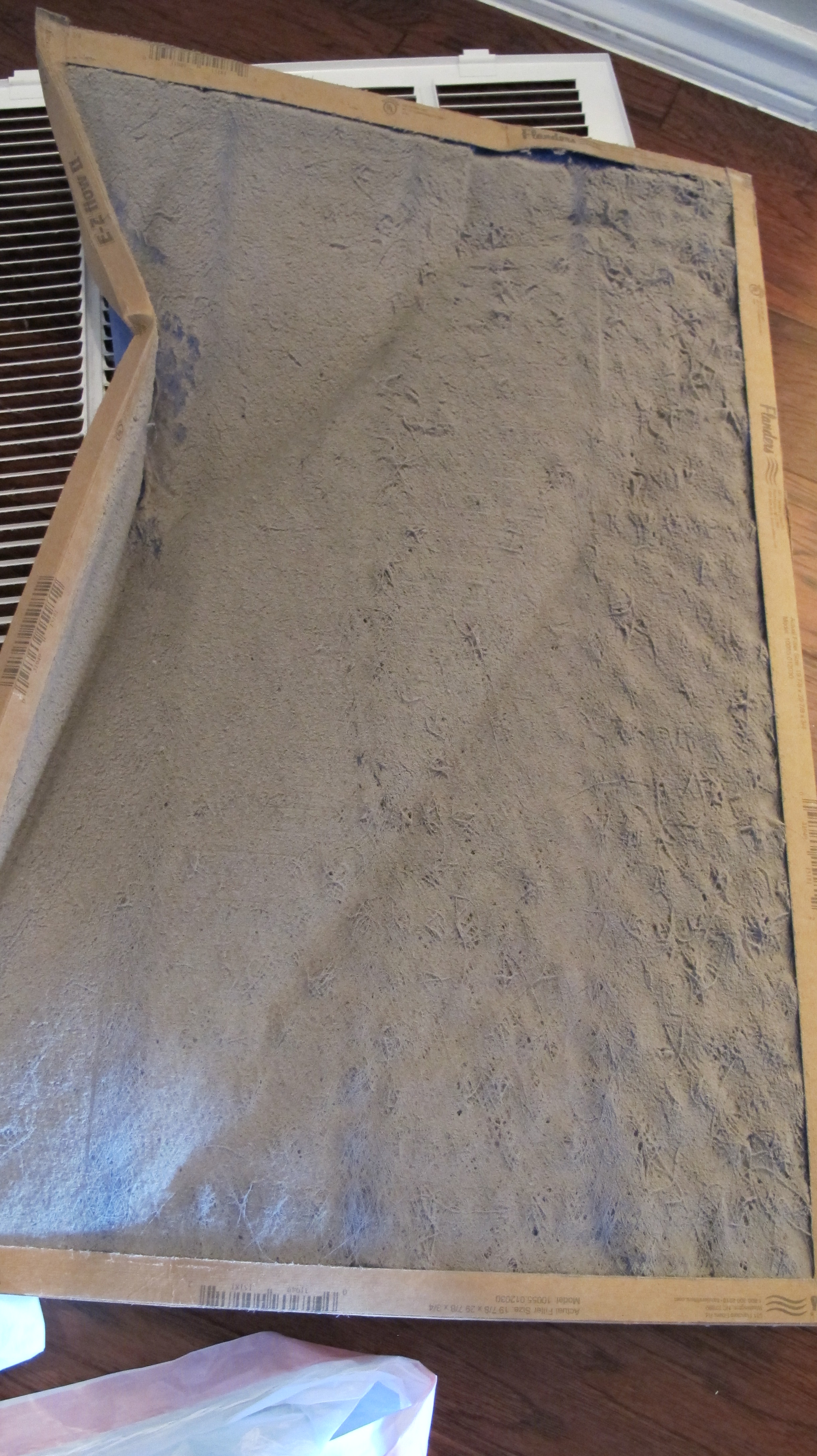 I’d been noticing more dust around the house than normal lately (especially in our bedroom) and realized that we hadn’t changed our air filter…. ooooh, since we moved in. Last February. Our air filter is located in the ceiling of our hallway, It’s a darker area of our home and since it’s up high (and I’m vertically-challenged) I never really thought to look up. So, imagine my horror when I finally checked it out and discovered this…