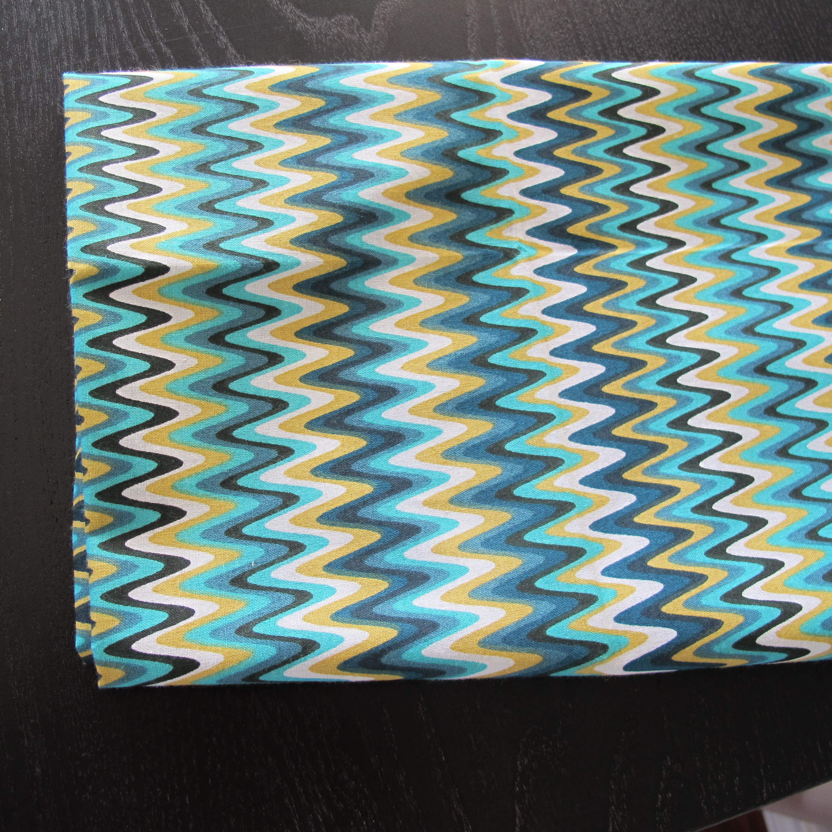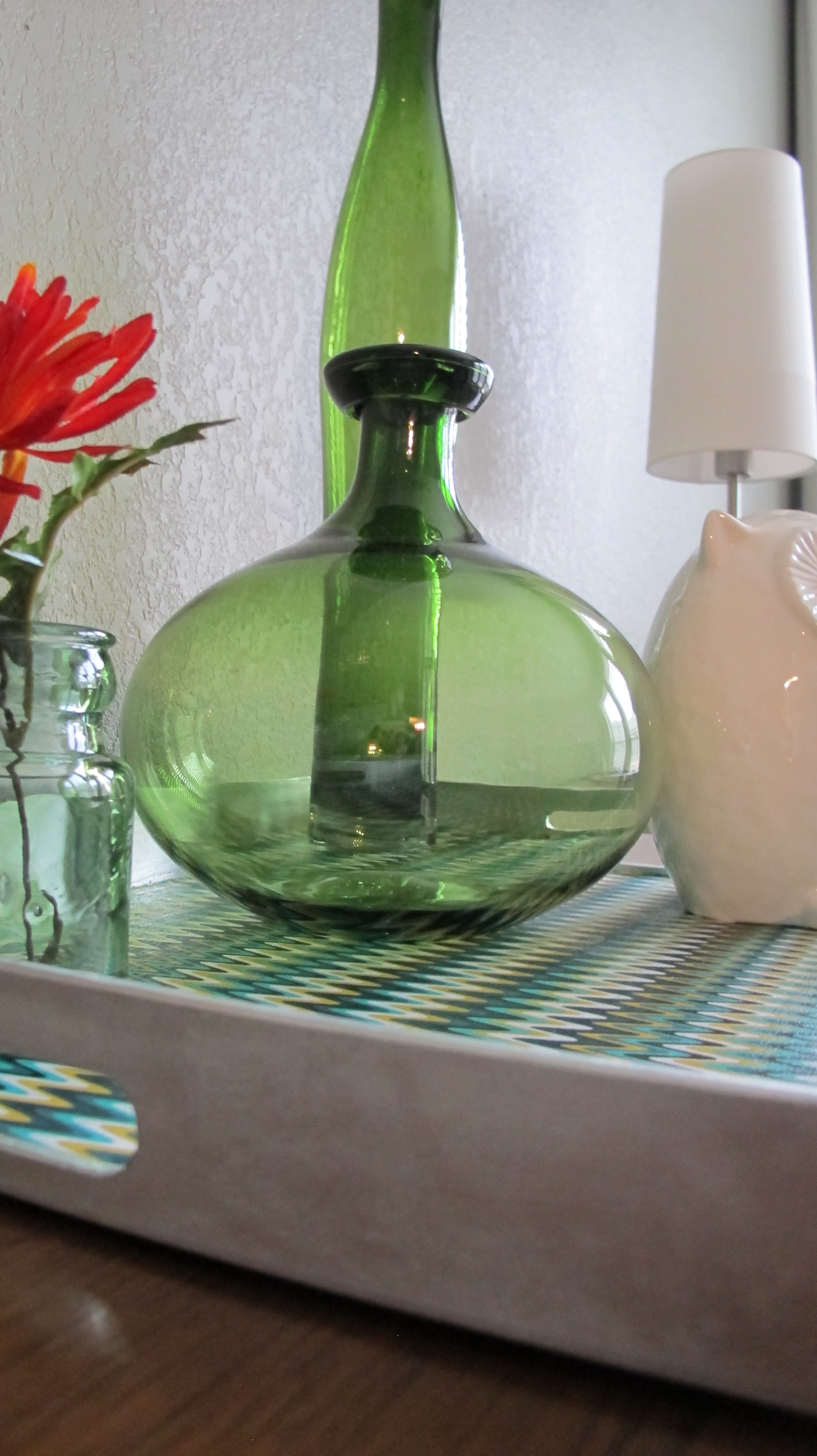 It’s a 1/4 yard that I picked up for 99 cents at Walmart a while back. I set the fabric inside the tray, added a few vases and such, then left it all like that to make sure I was completely gung-ho before enlisting any permanent changes. Honestly, I loved the fabric+tray combo immediately. The fabric brought just the interest I was looking for, the colors were great in the room, and the retro-ish print totally meshed with our mid-century dresser (his name is Drex for any newbies to the blog). My plan was to Mod Podge the fabric to the bottom of the tray. But then I got lazy, and nothing happened for several months.