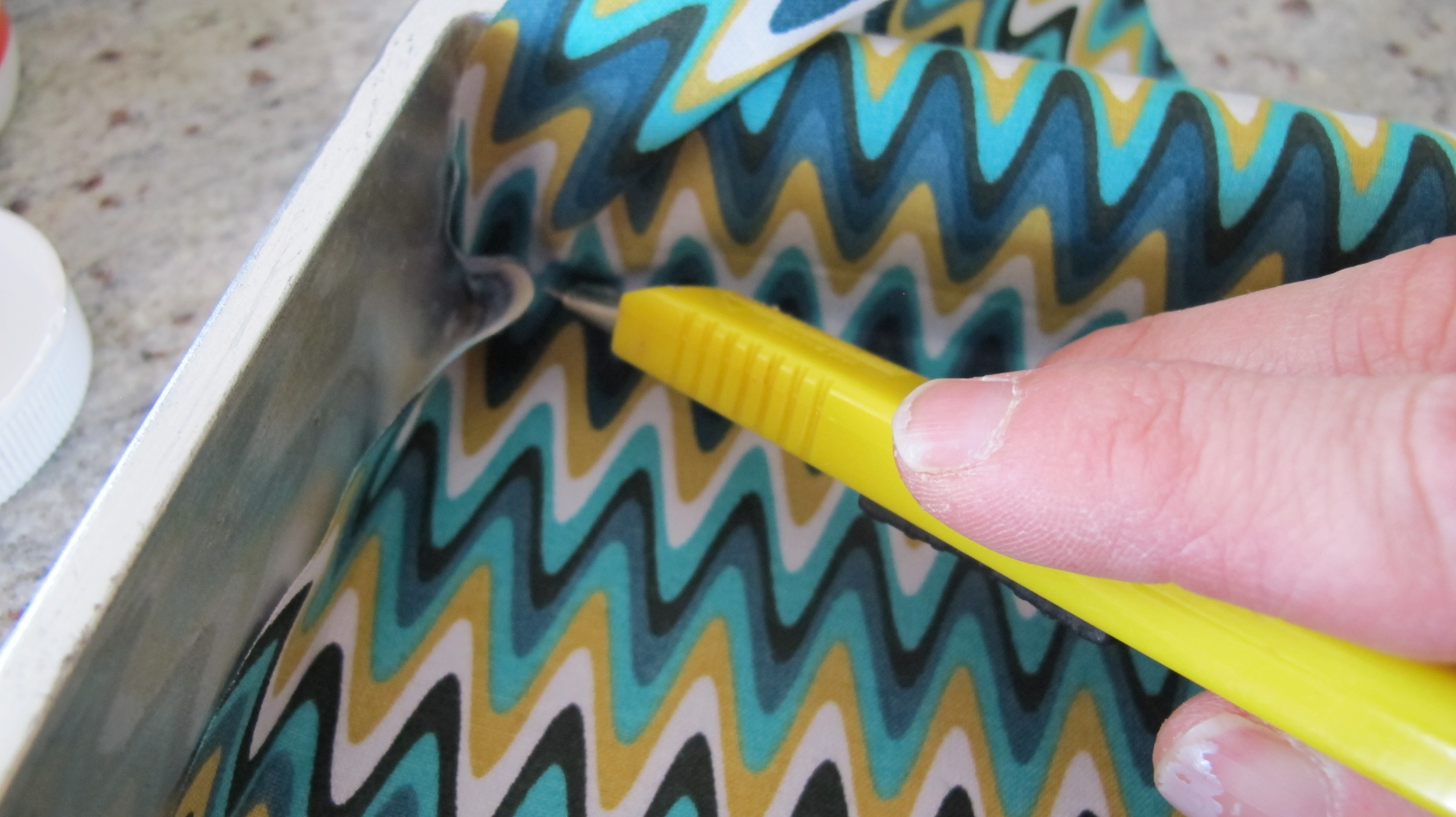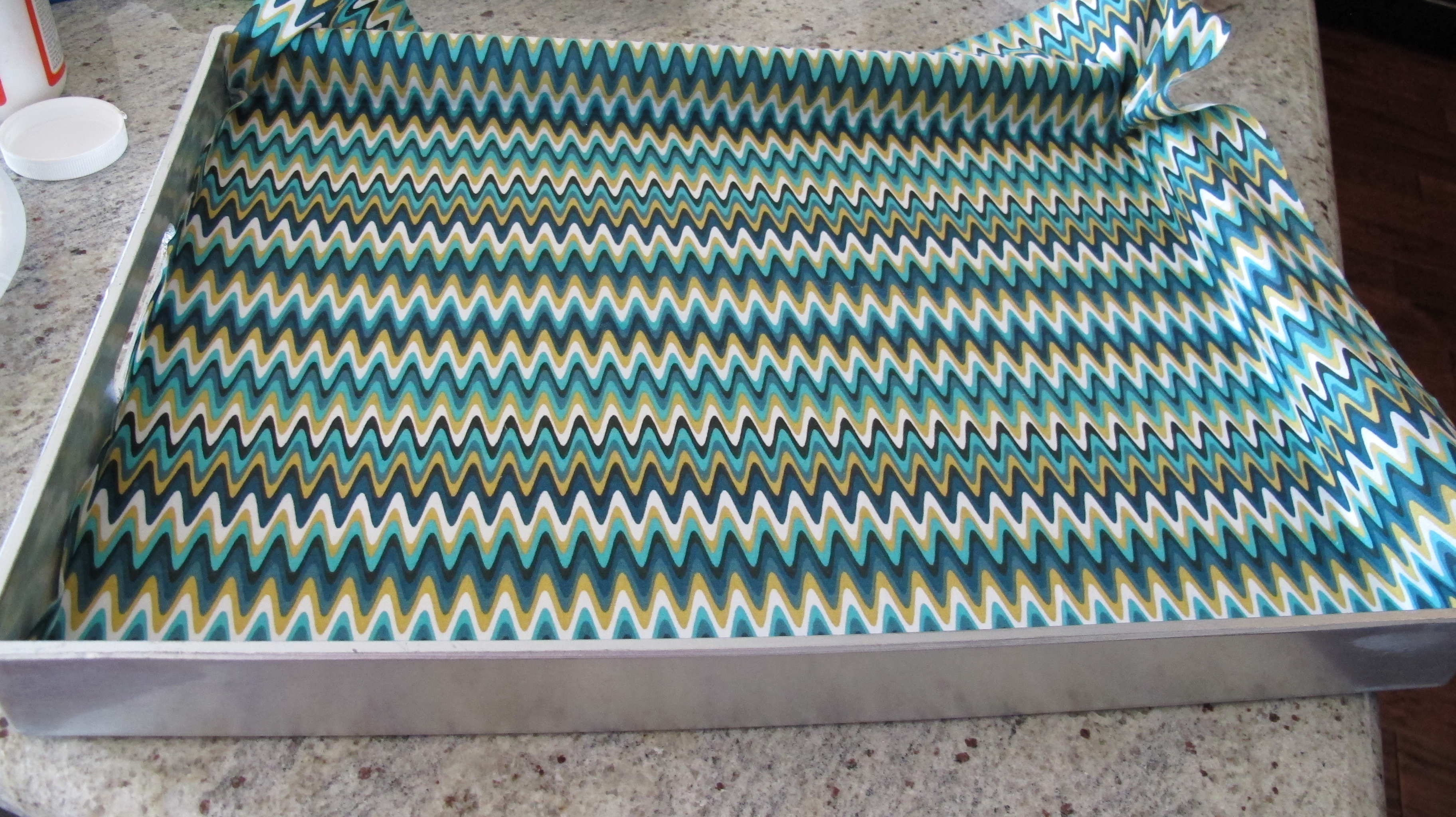 This time it went on like a champ. Nice and even. No beading. Woo-hoo! Once the bottom of my tray was coated, I pressed my fabric into the bottom of my tray and smoothed it out until it was nice and flat.