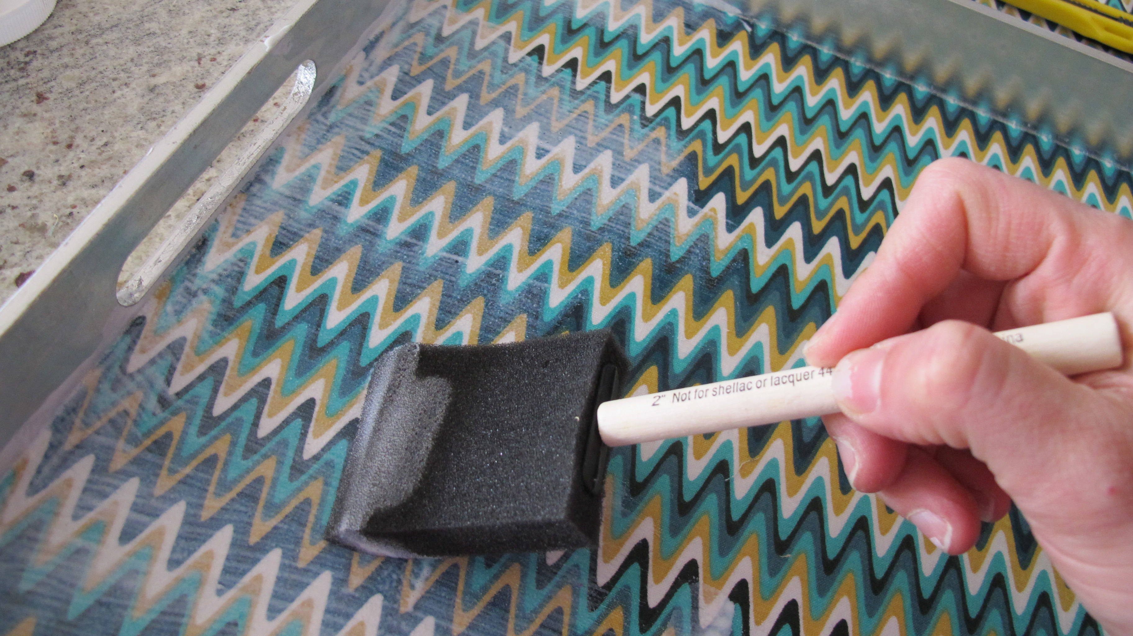 I began by applying Mod Podge to the bottom of the tray. And stop. The Mod Podge started beading up and acting like it wasn’t adhering. I realized pretty quickly that the surface of the tray was too glossy for the Mod Podge as it was. So, I grabbed a damp paper towel and quickly removed all of the Mod Podge. Then, I used my vinegar/water cleaner and thoroughly cleaned my tray. Next, I busted out a liquid deglosser and applied it to the bottom of the tray to rough it up a smidge.