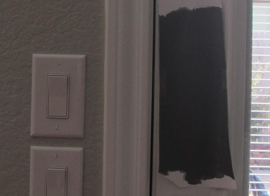 They stayed up there for about a week because I wanted to be sure that I liked my pick in all types of lighting.  In the end, the winner was the top swatch (Ebony Field by Valspar).  I went back to Lowes and picked up a quart of primer+paint in semi-gloss to save me a priming step…
