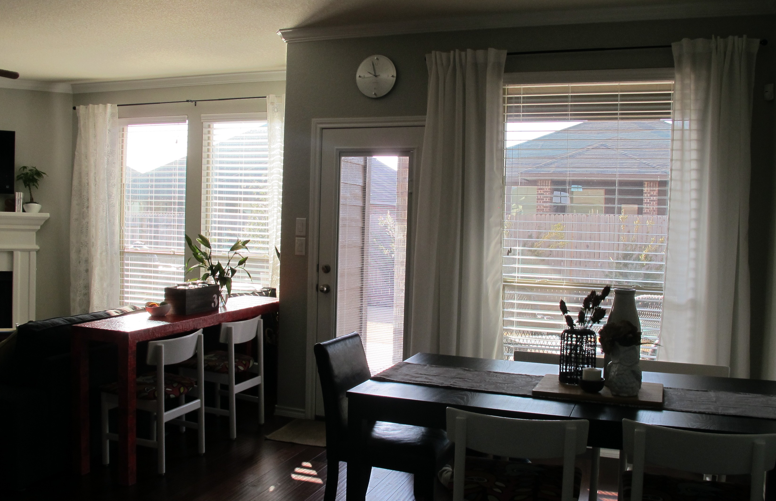 It’s hard to tell from this awful pic, but the undertones of the Rockport Grey (which are more blue) don’t go with our Dolphin Fin wall color (which has more of a green undertone).   It’s crazy how colors can read so differently in another room (or another part of a room in this case).   The angle of our fireplace and the difference in lighting due to the large windows in the living room allowed the Rockport Grey to take on more of a green cast which went great with our wall color when it was displayed on the fireplace.  Our windows are Low-E windows which have a slight green film to them (you can see it from certain angles when you stand outside) so the larger and brighter the windows, the more of a green cast the light provides.   The smaller windows in our breakfast nook don’t provide as much light because they’re under the covered porch, so… less green.   Which explains why the Rockport Grey appeared more blue in this part of the room.   If there’s one thing I’ve learned since moving into our house it’s that it’s always a good idea to hang paint swatches in multiple areas of a room (during multiple parts of the day) to make sure your chosen color is truly what you want.