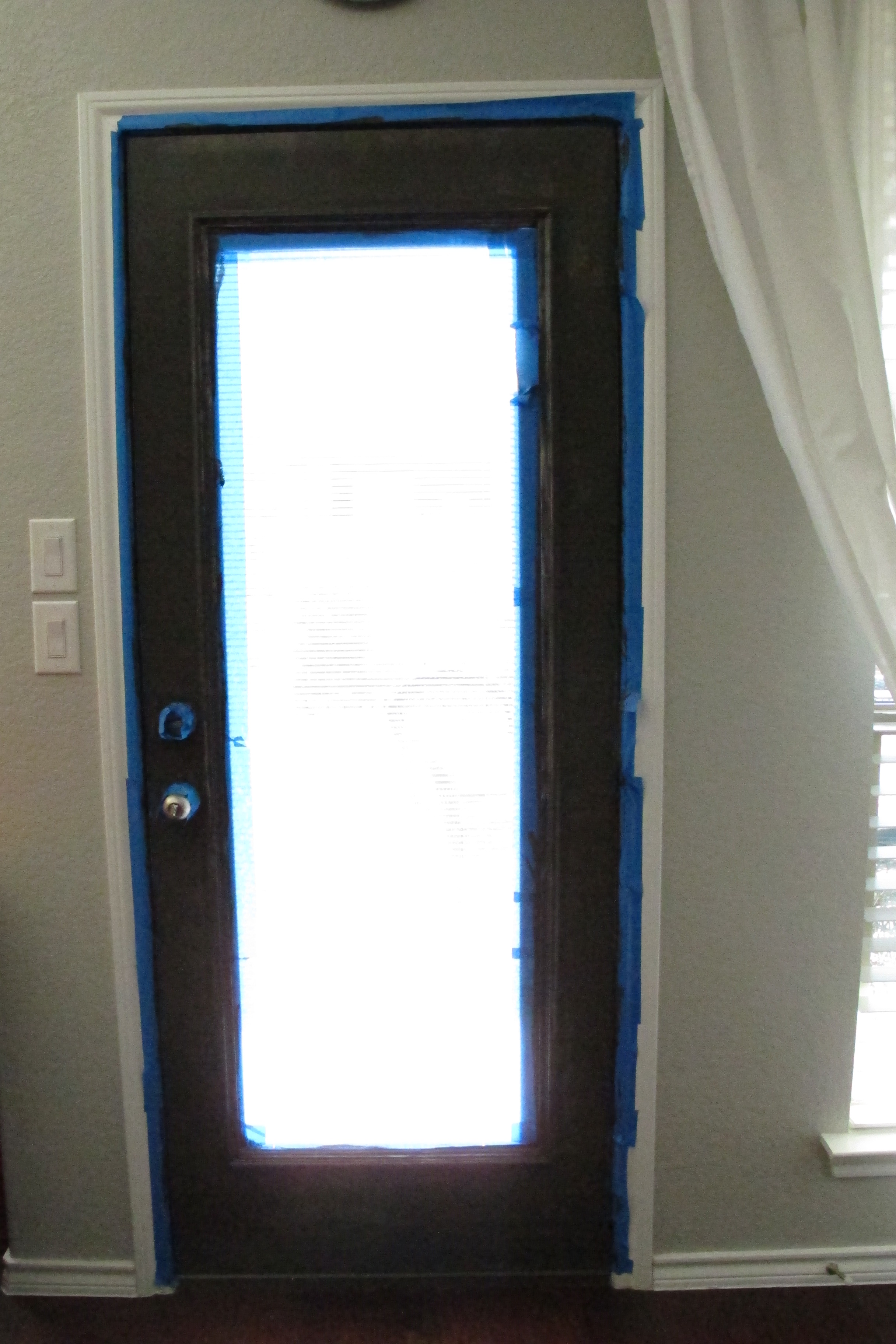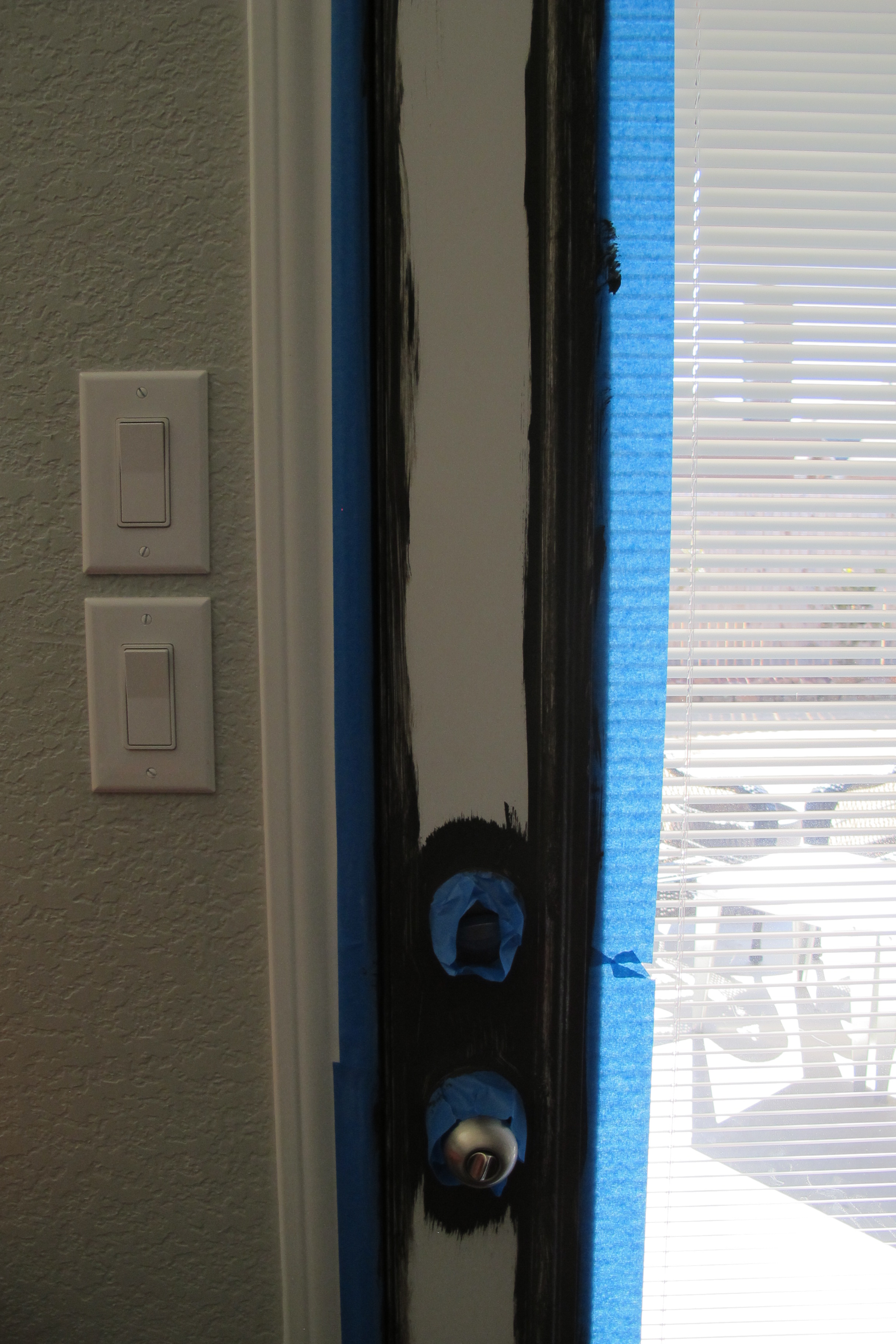I prepped our door by thoroughly cleaning it with my water/vinegar spray to remove any dust or dirt, then I wiped it down thoroughly with a deglosser (which is basically liquid sandpaper).  I taped around my hardware, window and door with painters tape…