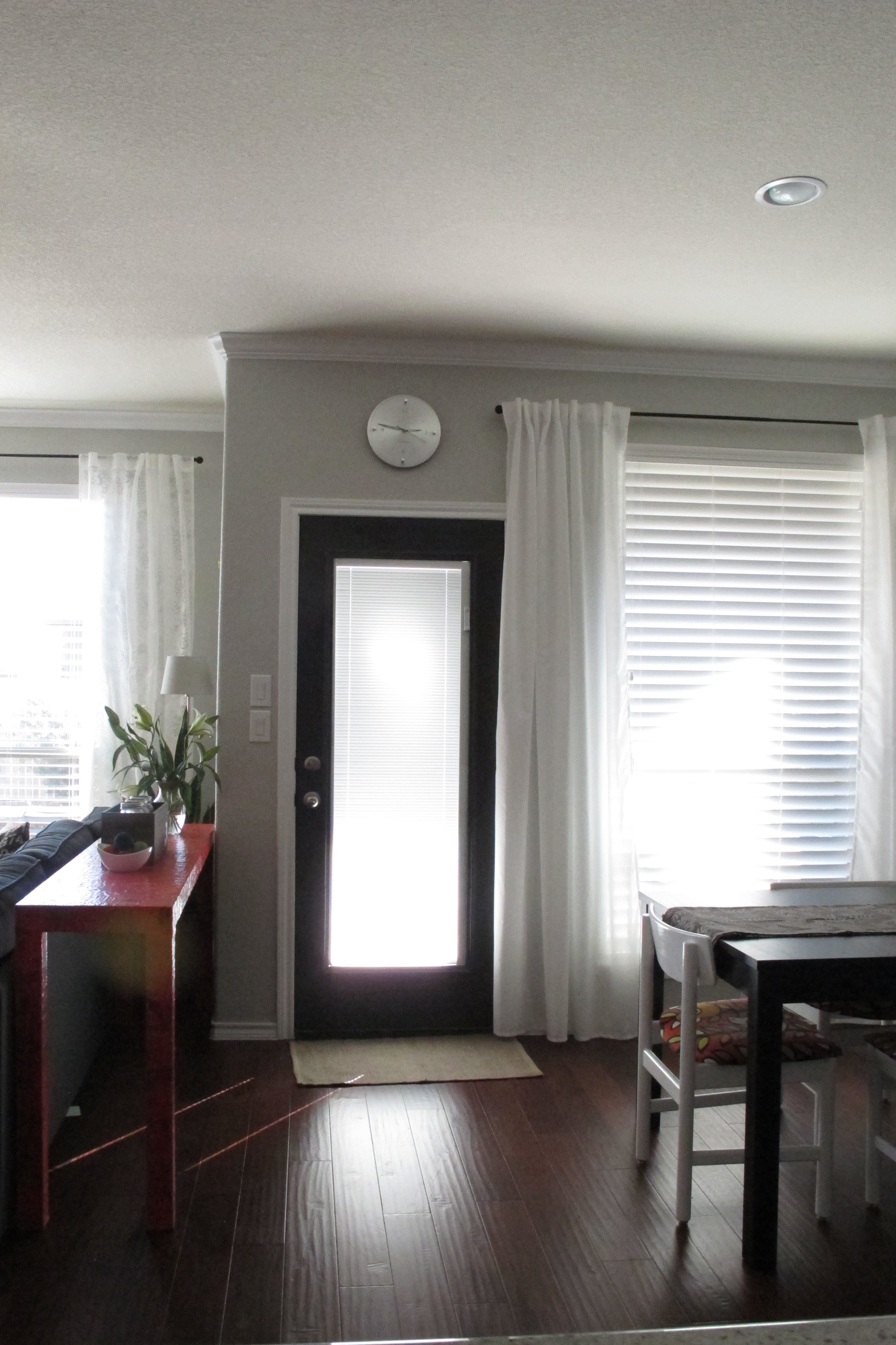 I need to redecorate a smidge around this area now to allow the door to shine.  In the first shot, I experimented with placing one of our bird chairs at the head of the table (instead of our black leather parsons chair).  Doing so definitely confirmed that a lighter, brighter chair is needed to replace the black one.   I ended up moving the black parsons chair back to the table afterwards since five bird chairs in one place looked far too busy, but now I’m definitely on the lookout for something new.    Different light, bright styling atop the sofa table is on the agenda as well.   I can’t wait to play!  So fun.