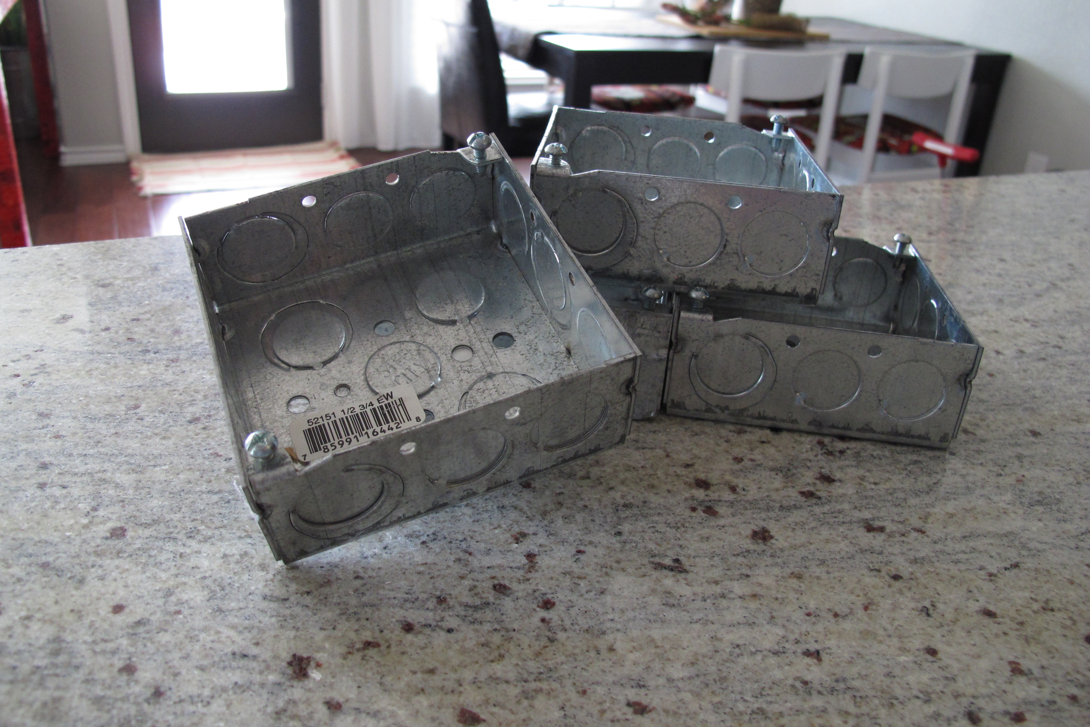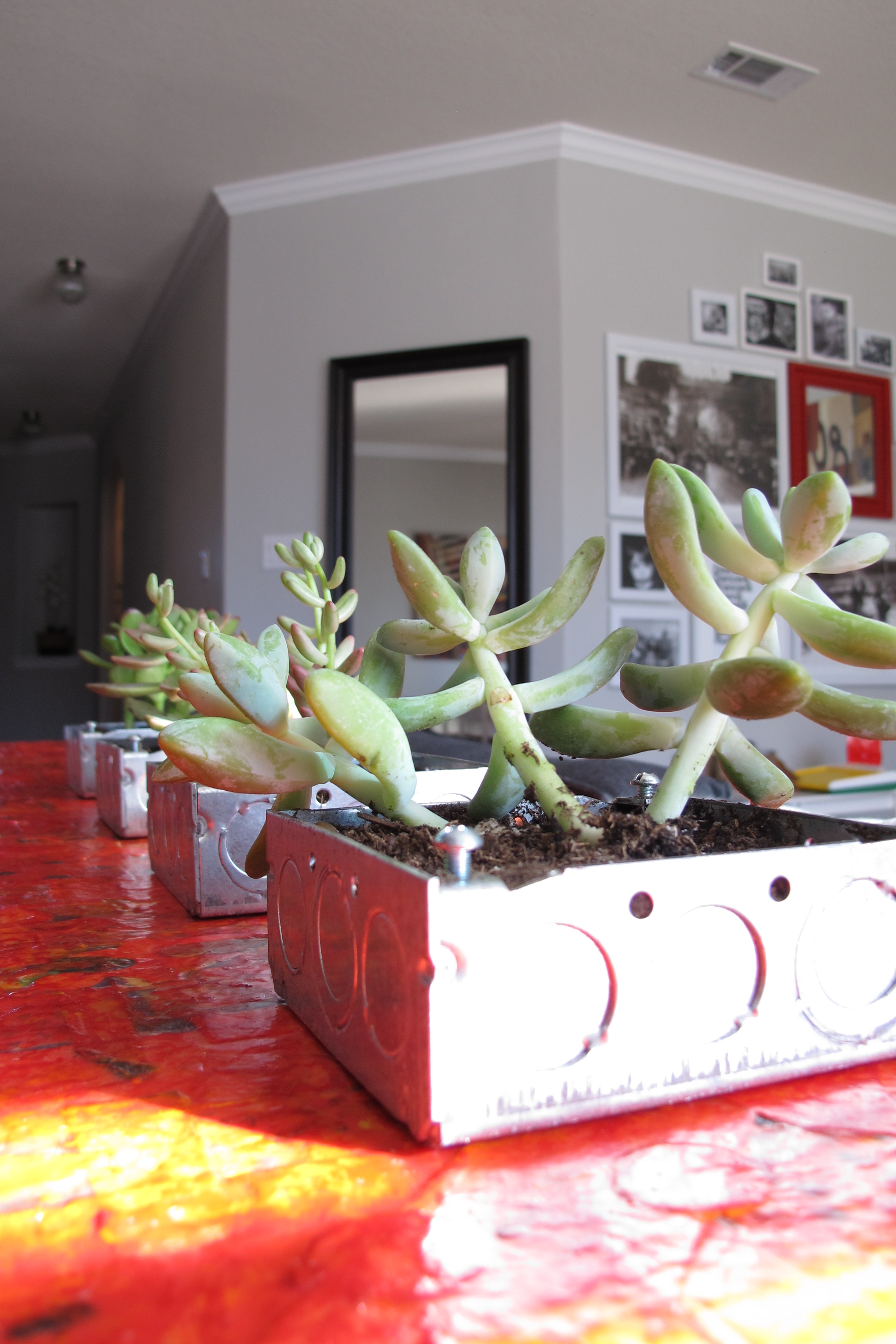 Four galvanized metal outlet boxes. I found them at Goodwill for 50 cents a piece. And they reminded me of a restaurant called Bolsa in the Bishop Arts district in Dallas. They used them as succulent planters for their centerpieces. My friend Ashley mentioned a while back that she’d followed their lead and DIYed some of the same. So, I decided to copy both of them and make my own, preferably to display on our sofa table. Remember how I mentioned that I needed to redecorate this area a smidge to allow our back door to shine? I thought these would be perfect. Industrial with a hint of nature and unobtrusive enough to play second fiddle to our newly painted door.