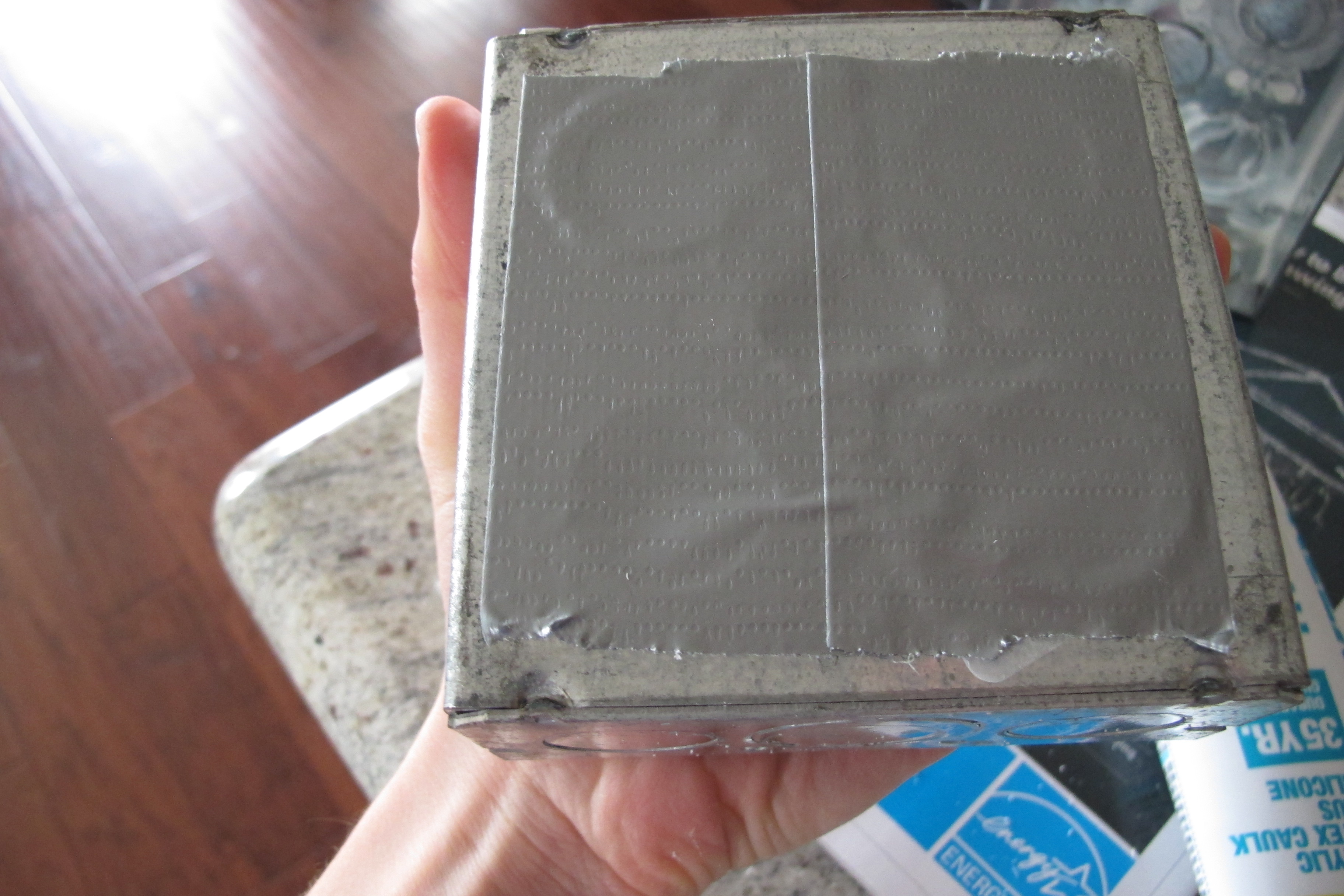 I remember Ashley mentioning that she needed to caulk the cracks in the metal boxes to keep the soil in, so I busted out some silicone caulk that I had on hand and did just that. I covered the bottom holes with duck tape (mainly to give the caulk a supportive surface to stick to for the larger holes)…