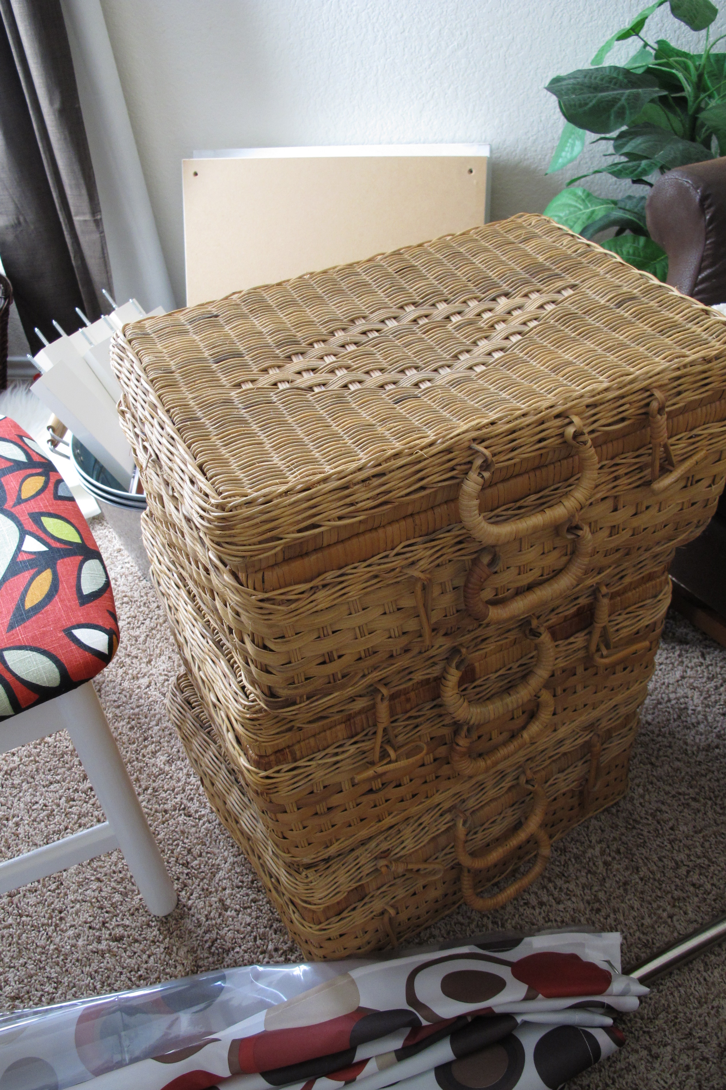 Obviously this pic was taken in No Mans Land.  Our resident dumping-ground.  Anyways, it’s Spring-cleaning time at Joey’s parents house and Mac no longer needed these suitcase baskets, so I was more than happy to take them off her hands. Woo-hoo for neat, free stuff!!