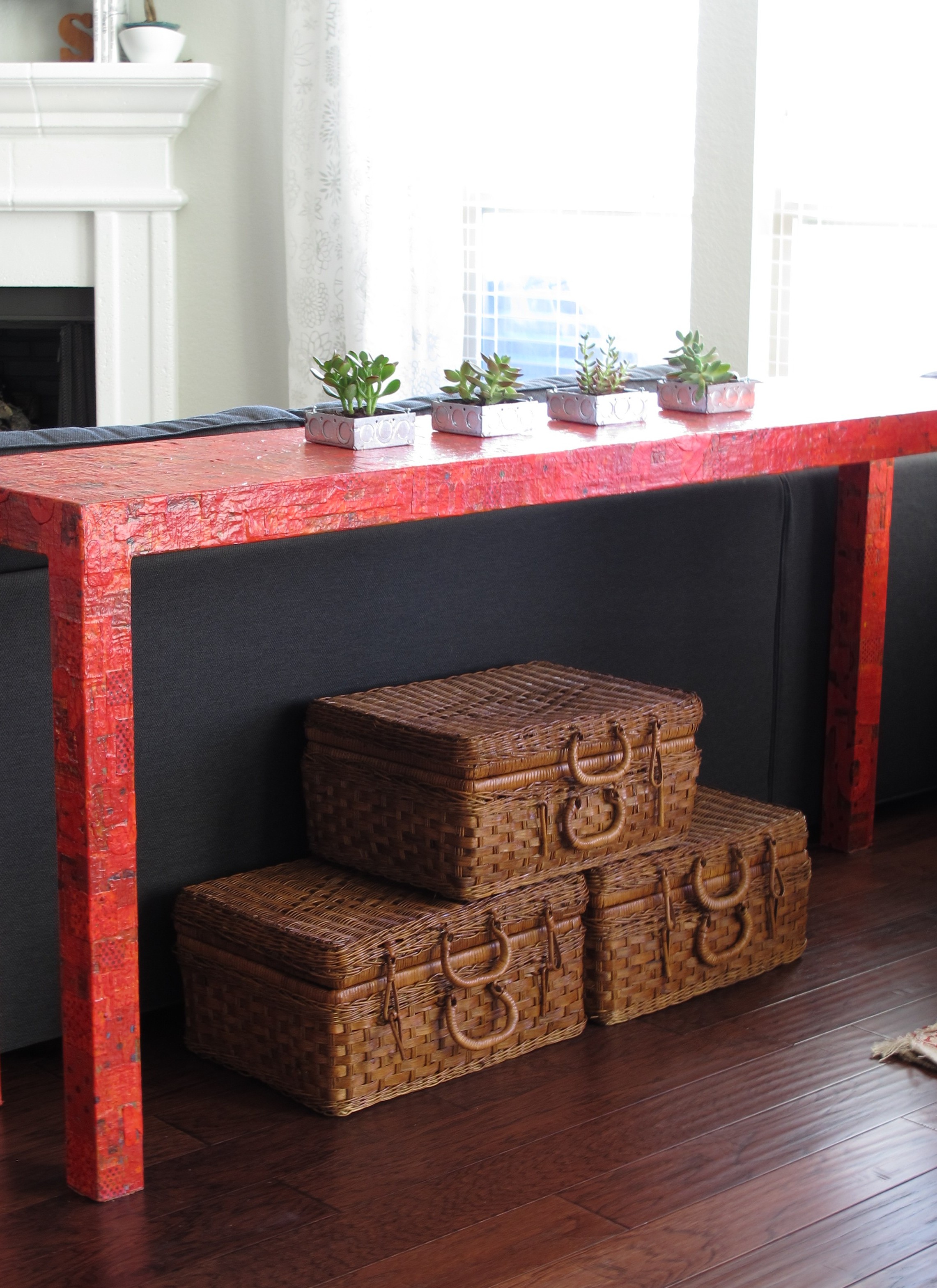 Their actual color is definitely closer to the farther pics… the close-up shot makes them appear way more yellow than they are in real life.  I have to say, I smile every time I see them.   They add some great natural texture to contrast the sleek metal-encased succulents. And I love that they aren’t just another basket. They have interest and detail. And the new rich tone goes SO much better with our coffee table and media cabinet. Plus, they provide additional storage!  Three cheers for that!! Now, if only the perfect chair for the head of our table would enter my life… Then, this area would be pretty complete (for now, anyways).