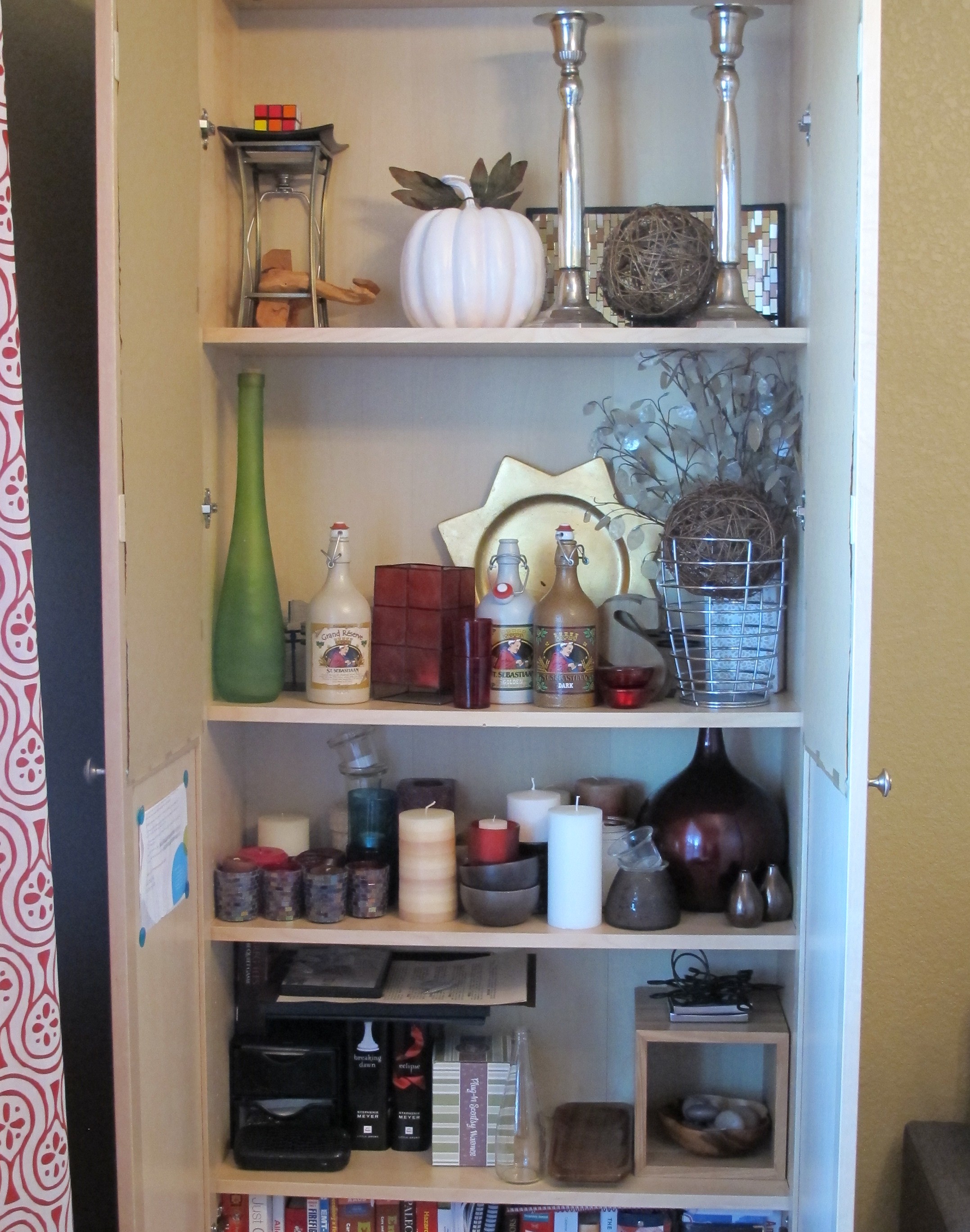Our extra decor items that aren’t currently in use. My cabinet of misfit toys, if you will. This is where I shop in my house for free. We also store some old textbooks and larger cookbooks in here. I love the storage that this unit provides and the fact that if I ever get tired of the current wrapping paper I could always change it for something more colorful for a completely different vibe.