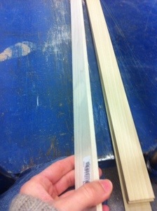 Once we were at Lowes, we meandered around the lumber aisles in search of suitable wood. We ended up picking up a few whitewood 1″x4″s and a few of these 1/4″x2″x4′ sticks…