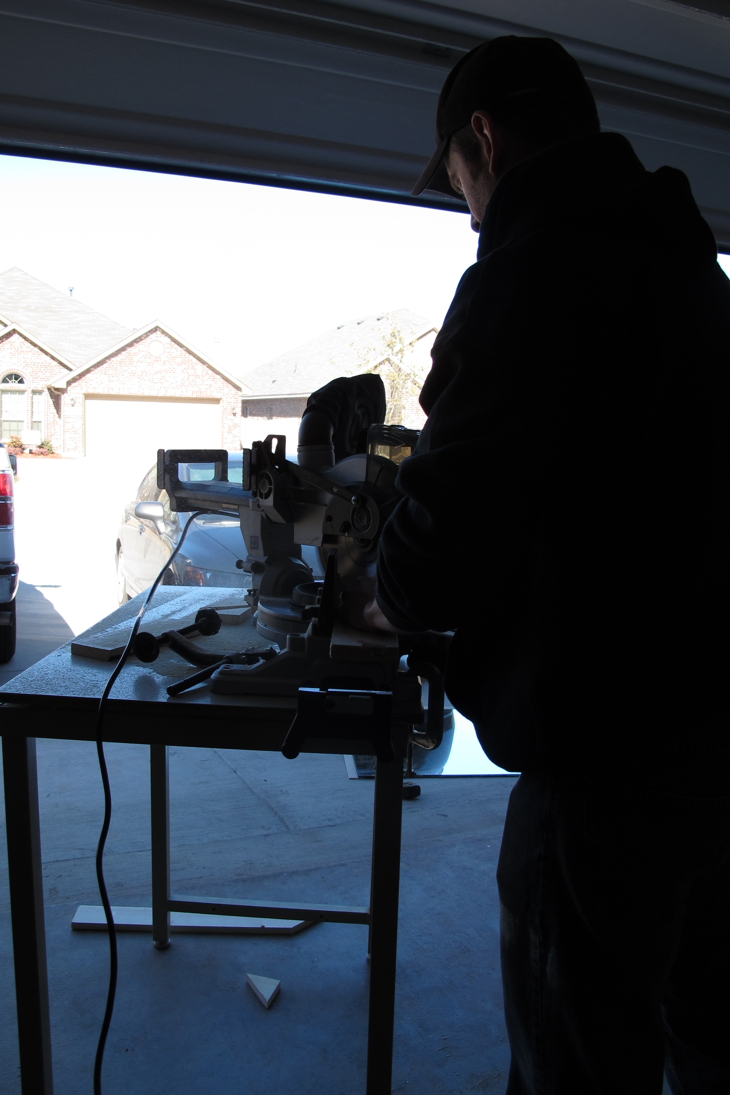 Once we got home, Joey measured and mitered the edges of all the wood…