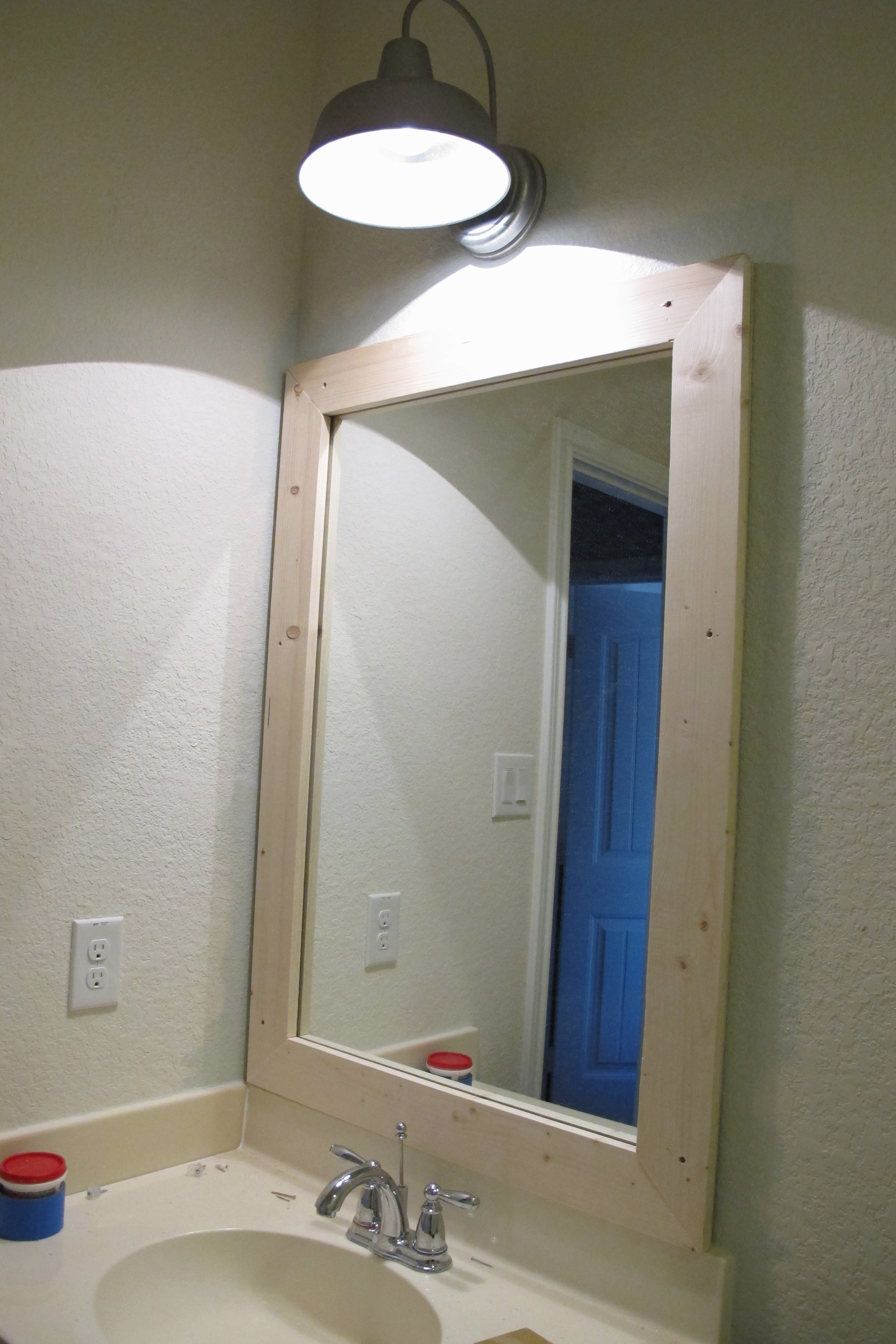 Anyways, we’re happy about how our frame turned out. It’s rustic, yet simple vibe jives with the barn light and is a nice contrast with our glossy painted tile. My only advice is that if you decide to use 1″x4″s, look for the straightest boards you can find. There is one tiny area that Joey is bothered by. It looked perfectly straight and flush when he assembled the frame, but when he secured it down around the mirror, one edge popped up slightly because of a mild warping in the board. It doesn’t bother me at all because we were going for rustic anyways, but if this is something that would drive you crazy, heed my advice.