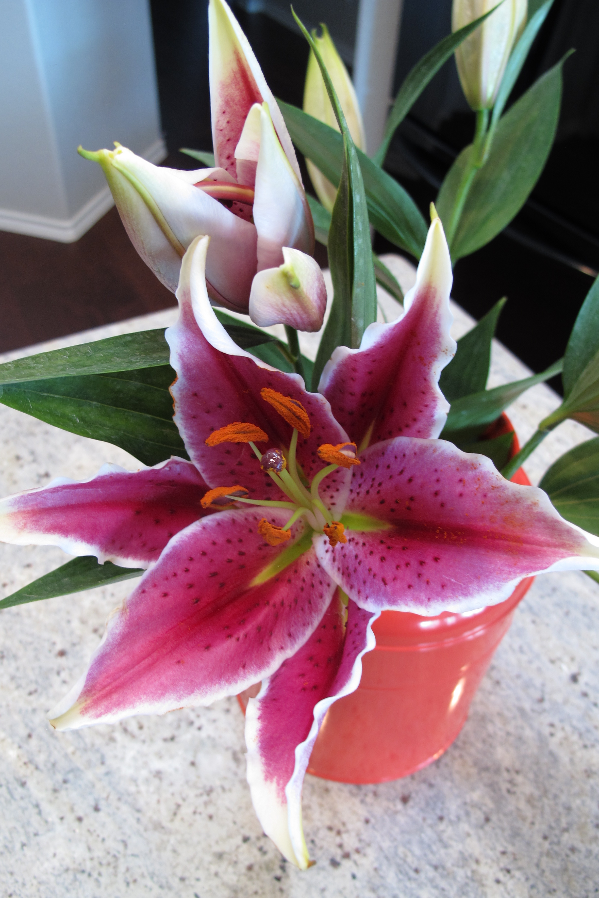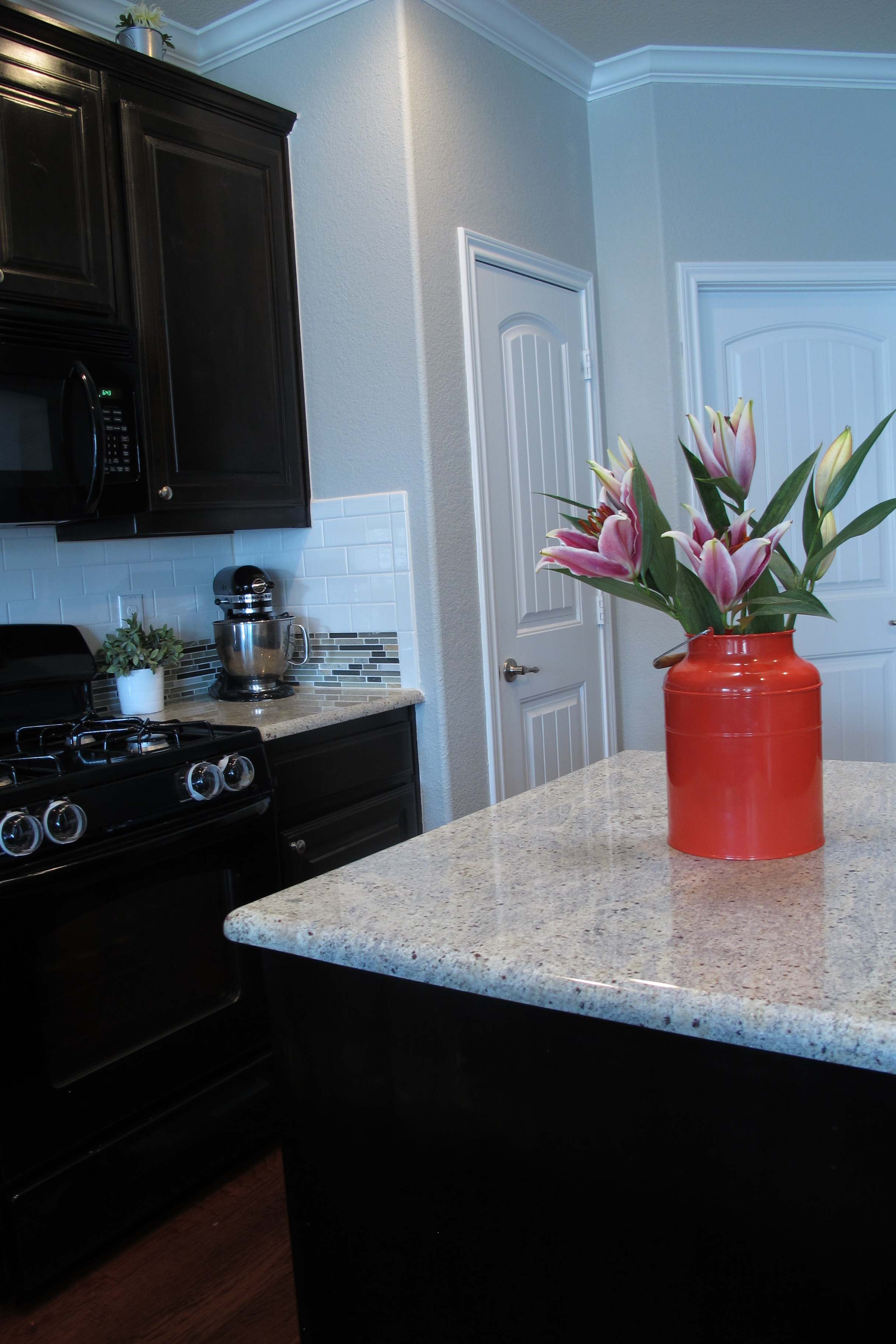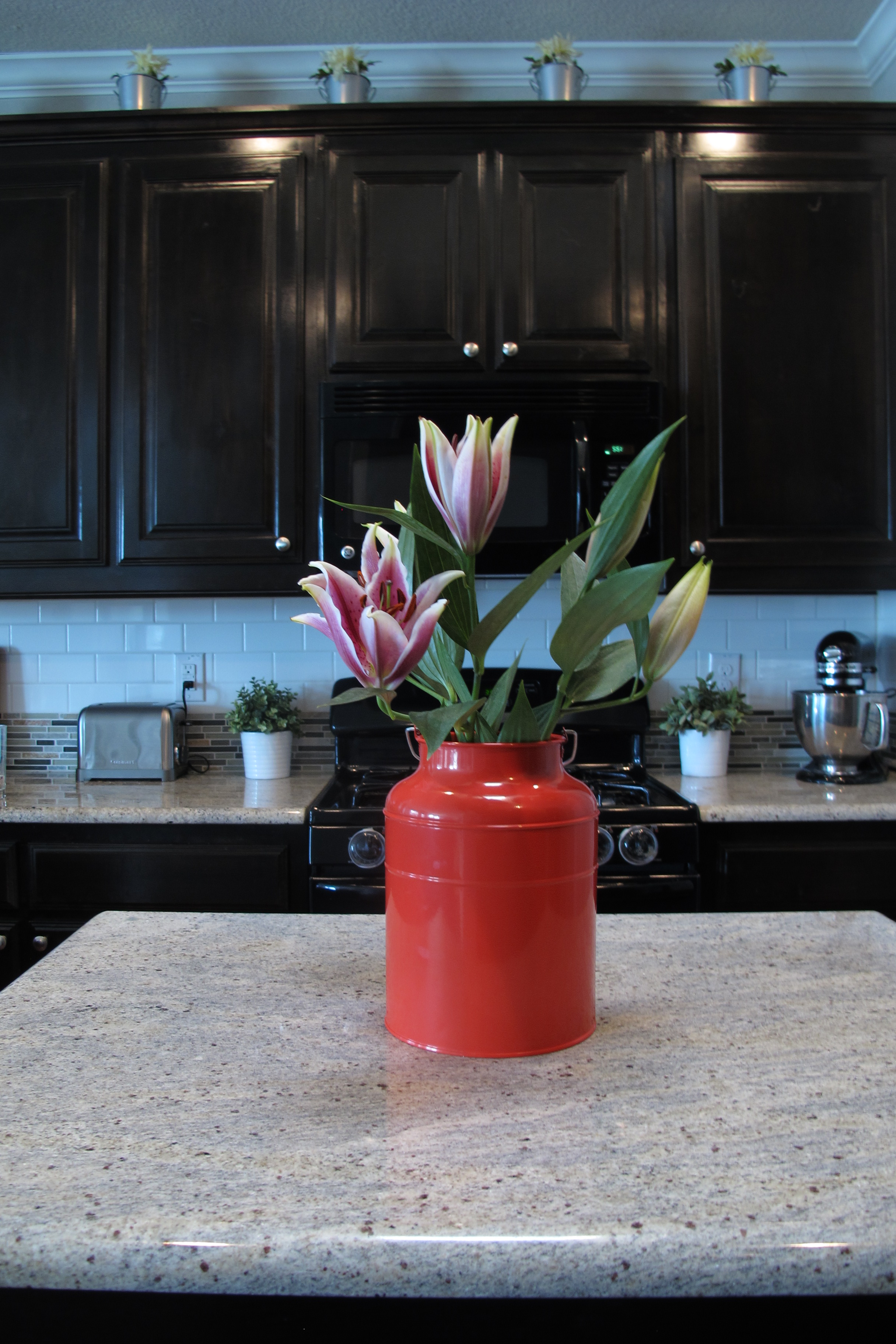 In true “me” fashion I couldn’t leave the gorgeous blooms in their simple glass vase. I’ve blogged before about a few simple vase ideas in this post… One of my first posts, actually!  Basically, when it comes to selecting a flower receptacle (Eh? Eh? Impressed with my vocabulary yet??), I like to do a walk-through… Just wander through the house until I see something that I can use as a vase. This time, I landed on an orange metal milk jug. I simply stuck the original glass vase right inside the jug and set it on the kitchen island for a splash of color.