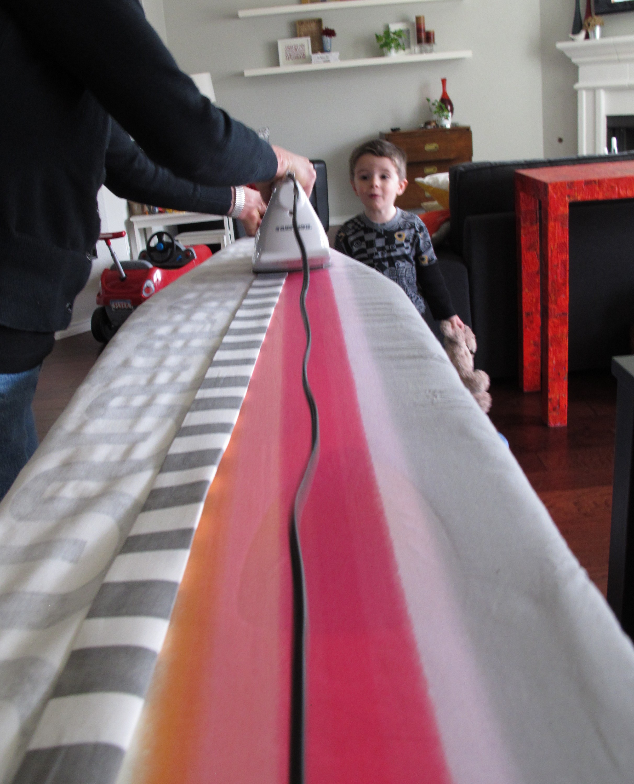 When I was finished, Mac folded over the edges that I’d just sewed a second time and repeated the ironing process. Iron, hem-tape, iron.   Then, I sewed over the edges again on all four sides to create a nicely finished edge…