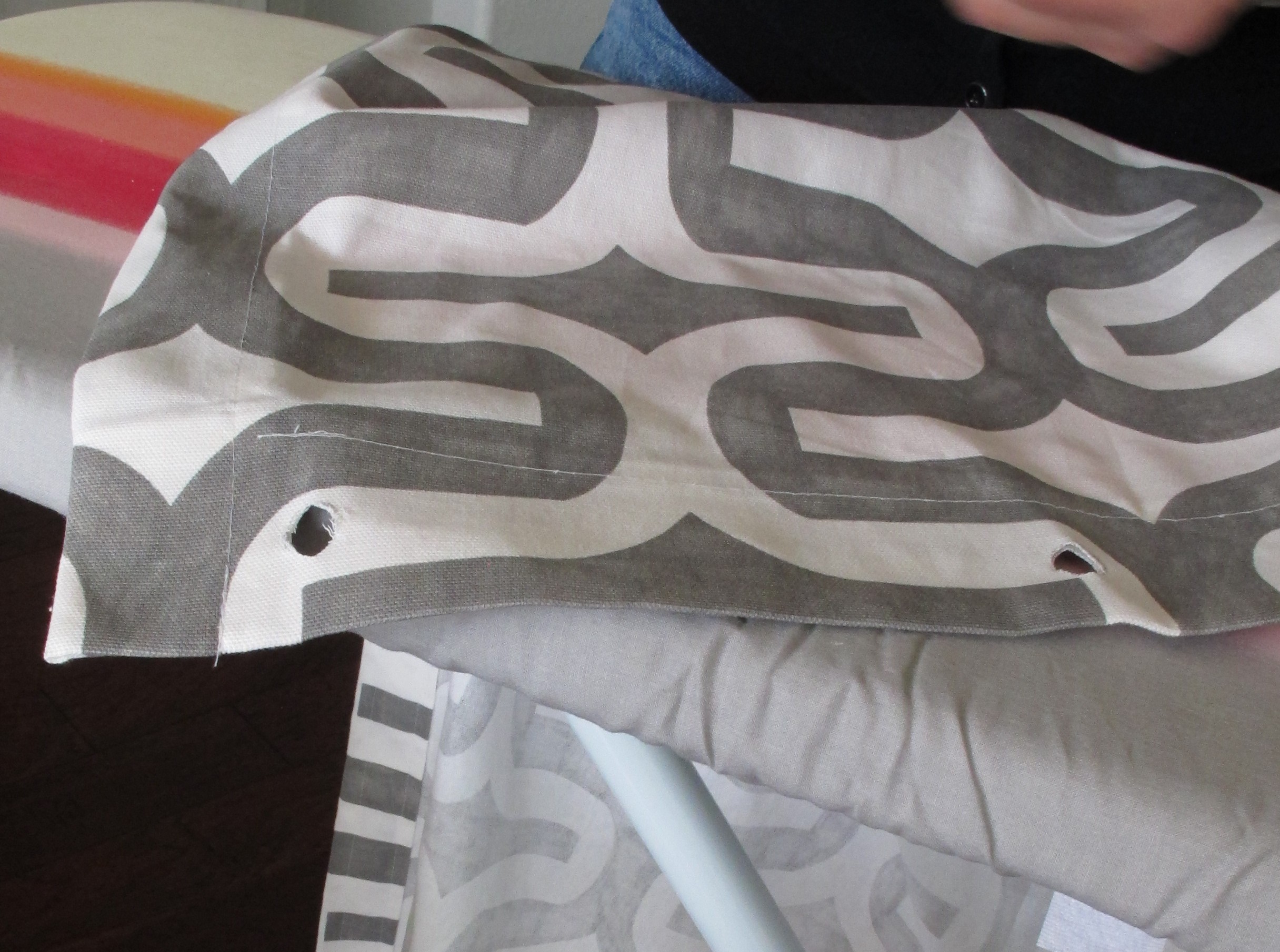 Thankfully, I’d over-bought on grommets, so I had plenty for a do-over. I re-grommeted the top of the curtain, then we rehung them…