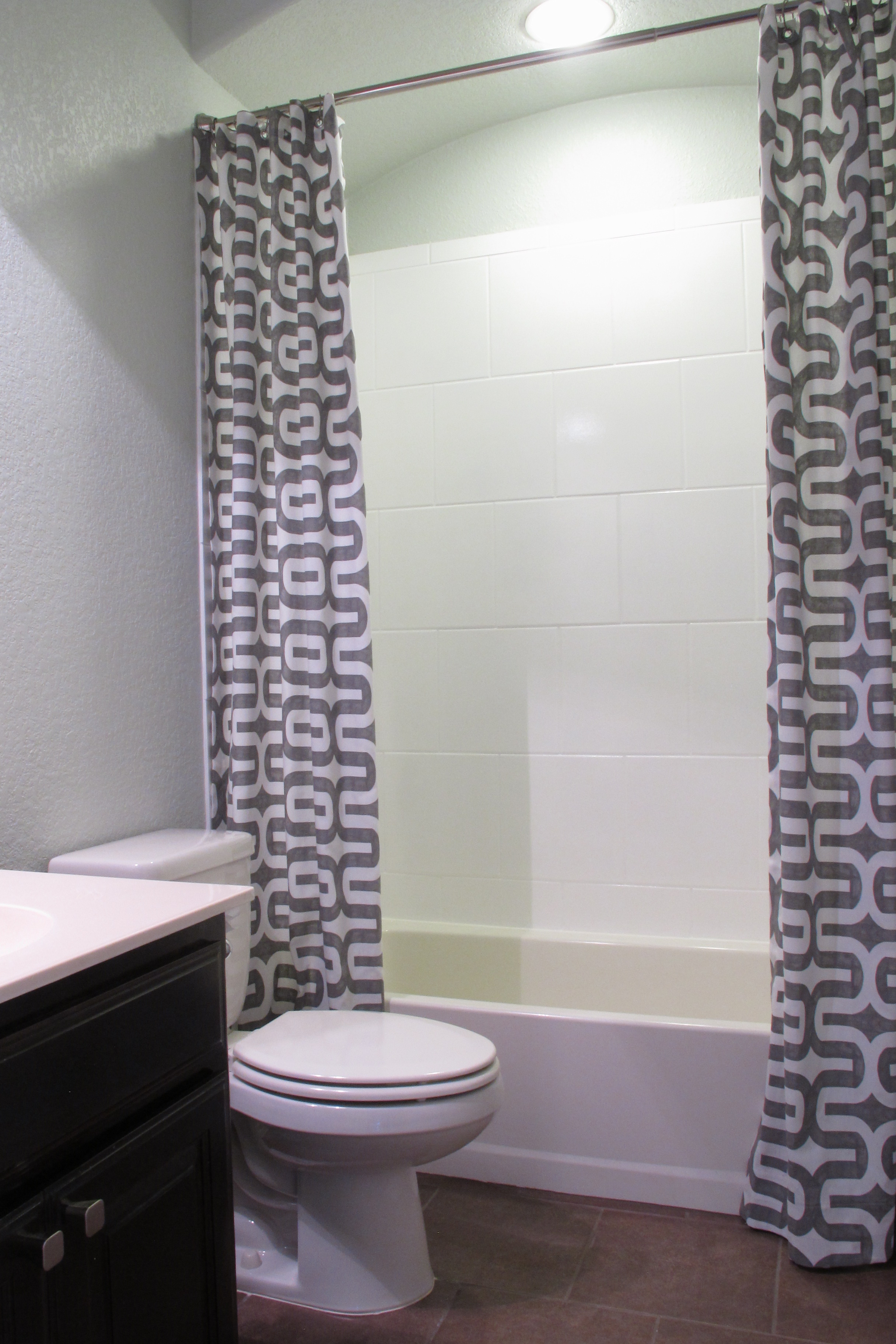 I still have to buy an extra long shower curtain liner.  I thought that I’d be able to make do with the liner we had, but it was too short.  So, really, my curtains aren’t functional yet, but they will be soon.  Woo-hoo!