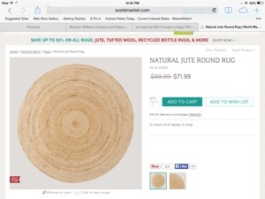 Pretty much right after I hit “publish” on that post I started yet another online rug search. Which is when I stumbled upon this 5′ round jute rug at World Market on sale for 71.99.