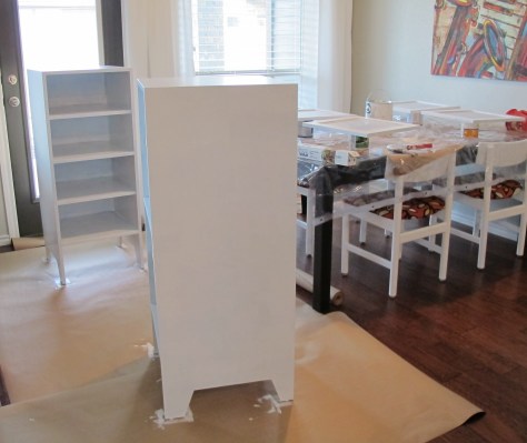 For this project, I have to admit that I did something pretty uncharacteristic.  I purchased a pricier paint from Sherwin Williams.   It’s the Proclassic paint in Extra White semi-gloss.   My main reason for going this route was that I wanted the units to match our trim paint (which was Sherwin Williams) and we were running low on what our builder had left us.   After painting our eight dollar chairs with leftover trim paint, I was so impressed with the finish that I thought it’d be worth it.   Unfortunately, the location that I visited didn’t carry the exact paint I needed, but they recommended the Proclassic, as they claimed it was very similar.