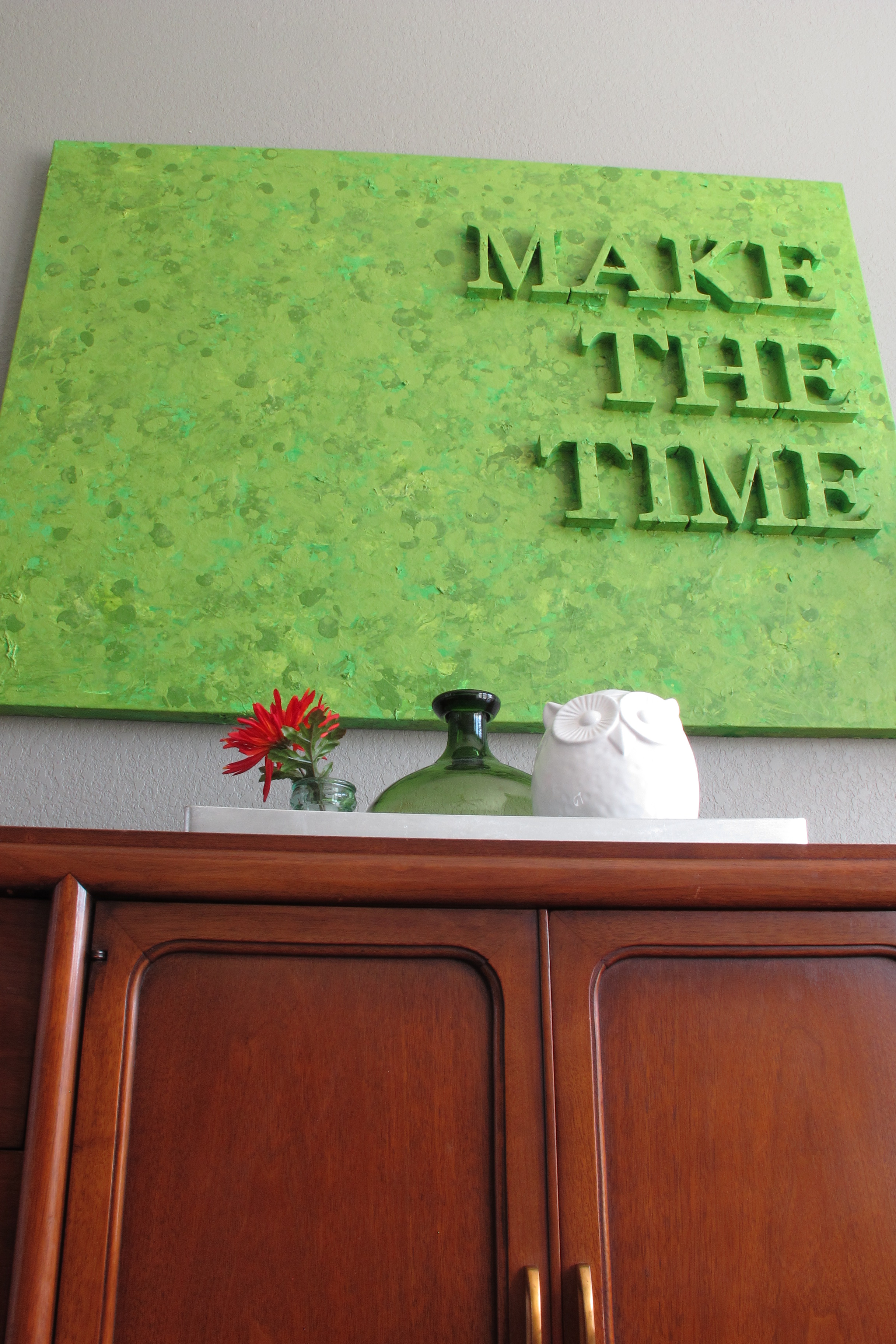 You can see that I was playing around with the styling as I took pics. I couldn’t help myself. It’s still not completely right, but it’ll get there eventually. I love that the green coordinates so nicely with our bedding. Happy accident, if you ask me. Plus, the painting is modern and graphic without being too in-your-face. And I like the message. Make The Time. To me, this means make the time to just do nothing. Make the time to sit and play and be silly with Lucas. Make the time to enjoy the little things. A good message to wake up to every morning, for sure.