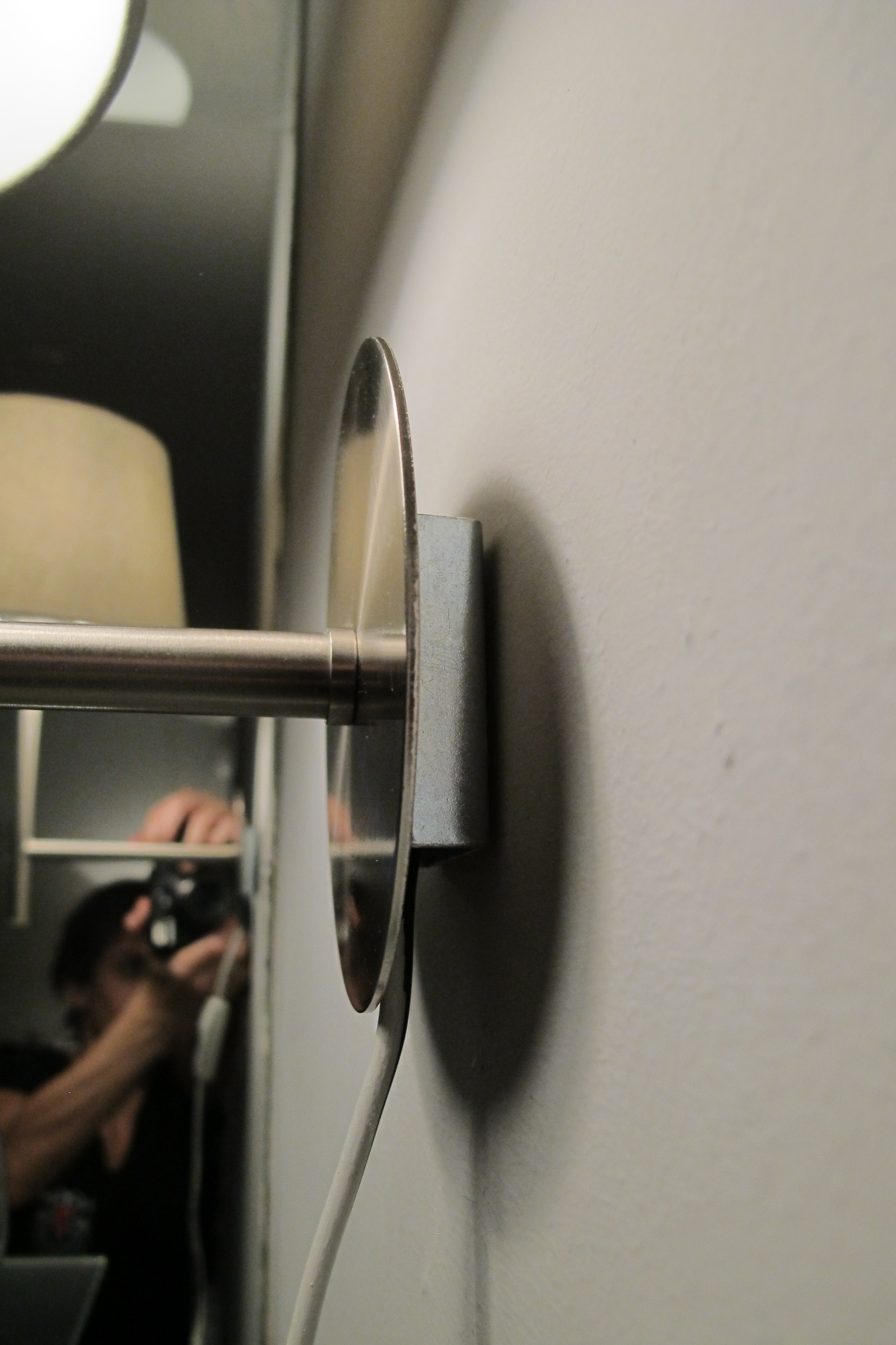 I just accessorized a wee bit, though I’m still noodling with it. As I mentioned in this post, this area will be completely transformed once we’re done with it. Since there’s no lighting on this side of the room, I hung an inexpensive plug-in sconce from Ikea. Because the side view of the mounting bracket wasn’t super attractive…