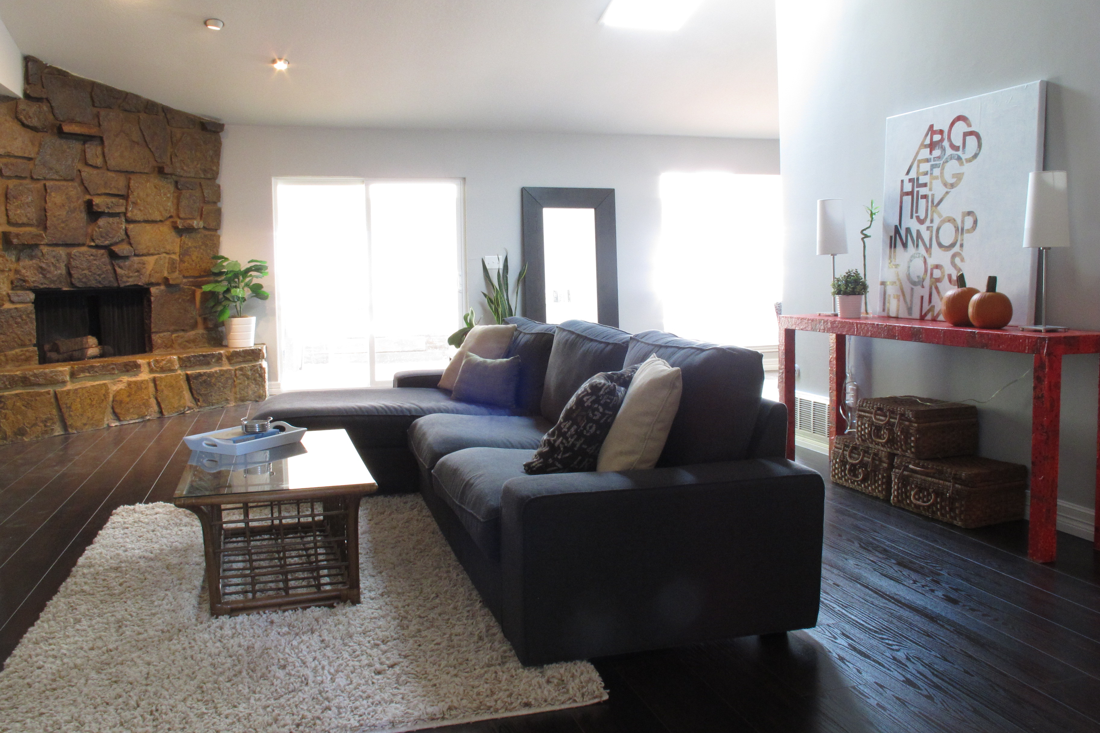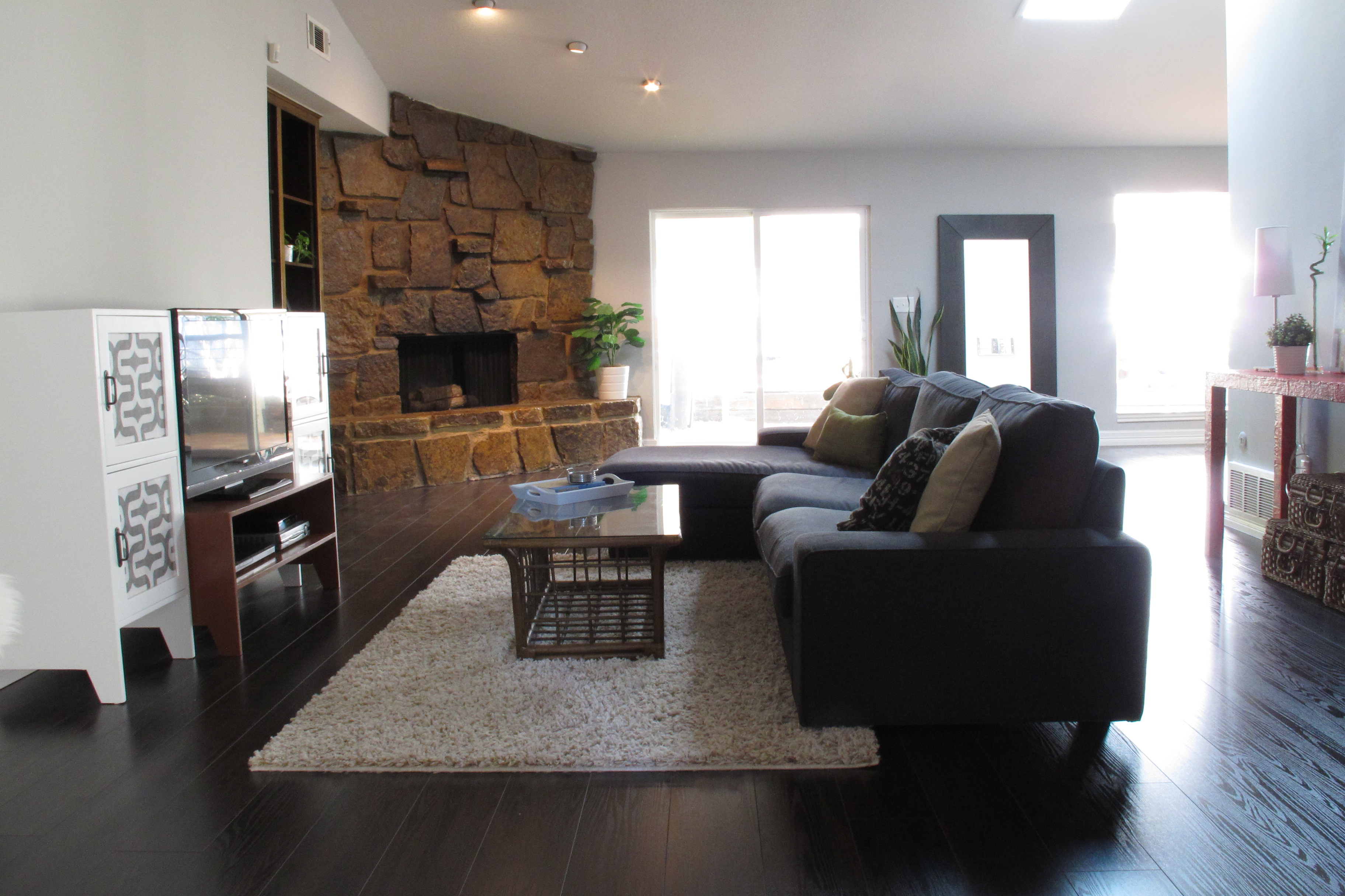 I haven’t officially hung any art yet. I’ve just been leaning things against the walls to get an idea of where I want them. As for window treatments, I’m kind of stuck on what to do for the sliders. I tried hanging a pair of white curtains the other day and it just looked silly. The fireplace is way too close to make curtain panels an option. I took them down almost immediately. I was thinking maybe bamboo roman shades hung high, but then the color is tricky as I don’t want them to compete with the fireplace. Hmmmm…. Only time will tell, I suppose.