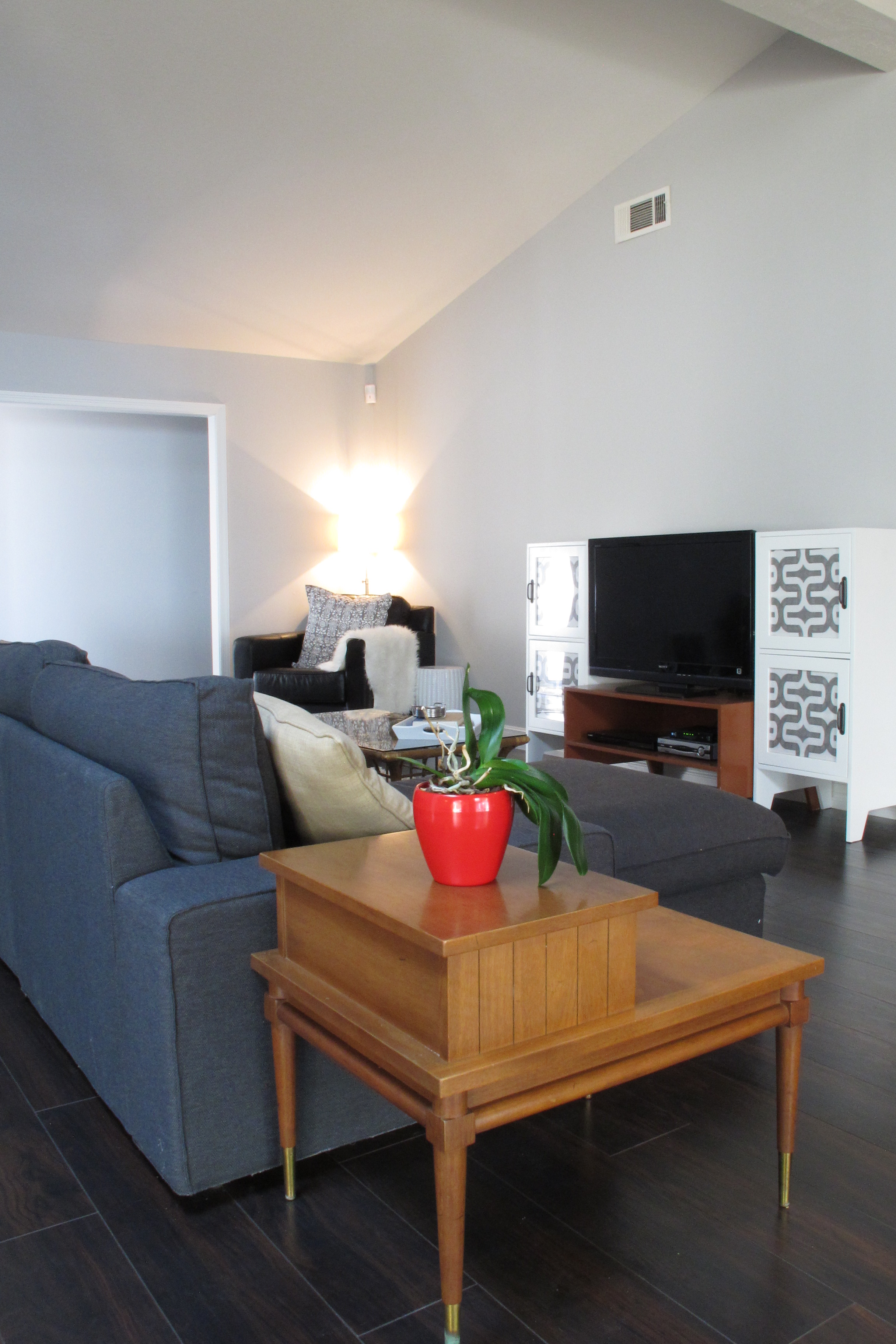 My cute little media unit from the last house didn’t work in here, so it’s in the foyer now. It was just too small to be a media cabinet now that the TV rests above it. We needed something larger to ground the TV. You may recognize the cabinets that I revamped for the foyer of our last house standing in. The TV stand between them was original to the set… I just need to paint it white if it stays. I’m just not sold on it staying. I’m on the hunt for some type of mid-century shelving unit or storage cabinet to replace it with, so that I can move these white cabinets to the atrium area of our bedroom. So, I’m searching for something cool. It might be a dresser. It might be shelves. It just depends on what I find. It needs to be something relatively narrow, but wide enough to accomodate the equipment. The world is my media-unit-oyster at this point. So, we’ll see.