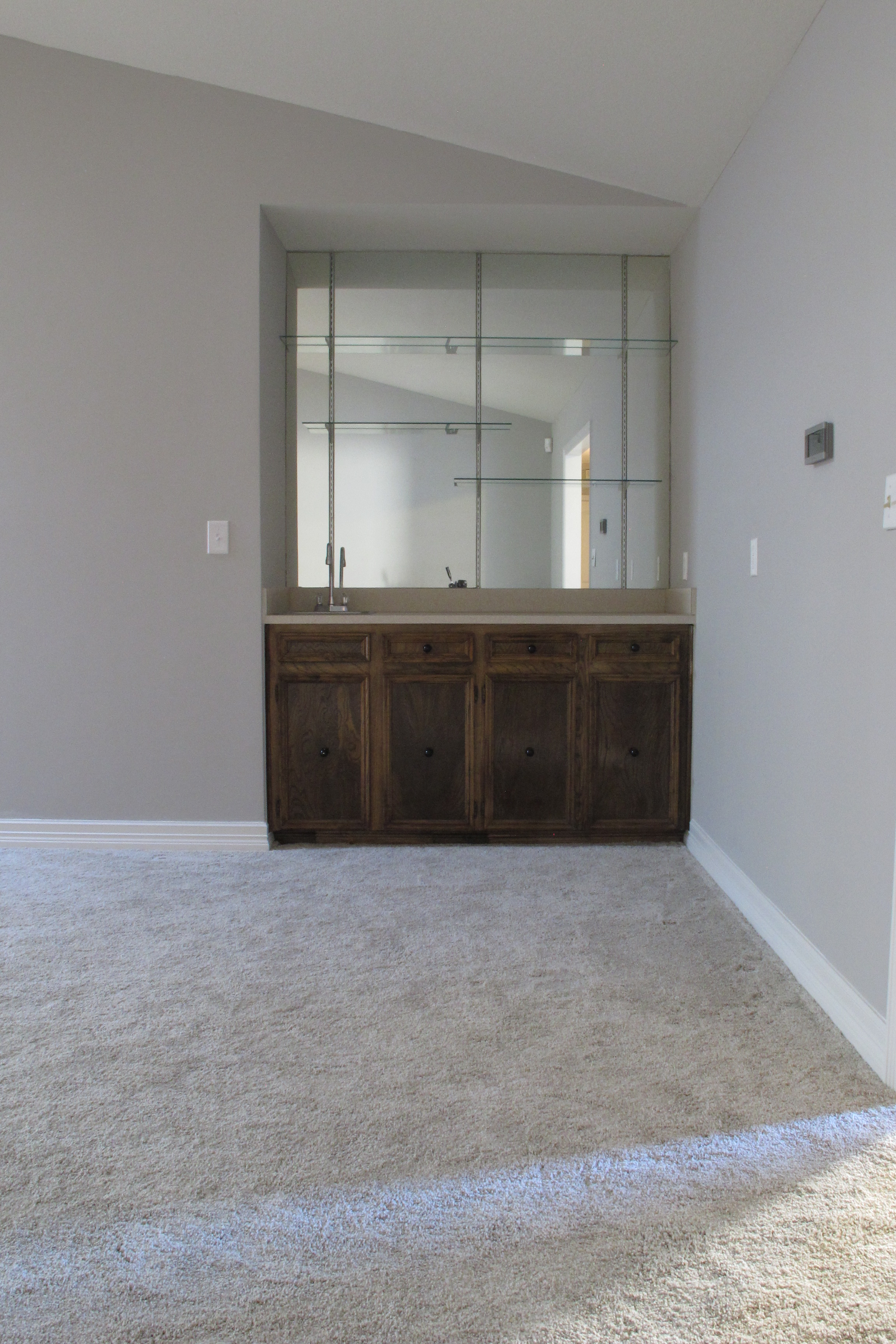 Unlike our other homes, we actually have smooth walls in this house, which is pretty rare for Texas.  The wall behind the wet-bar, though… NOT smooth.  Namely because I didn’t remove the glue.  But again, we’ll be tiling the wall, so it’ll be fine.  Once the primer was dry, I applied two coats of wall paint (Gallery Grey by Kelly-Williams).  And here’s where we ended up…
